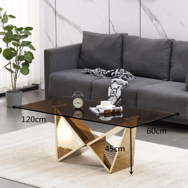 The coffee table is a stylish addition to any living room. It features tough grey tempered glass and sturdy gold stainless steel construction, ensuring durability and long-lasting use. Its visually appealing design adds a touch of elegance to your space.