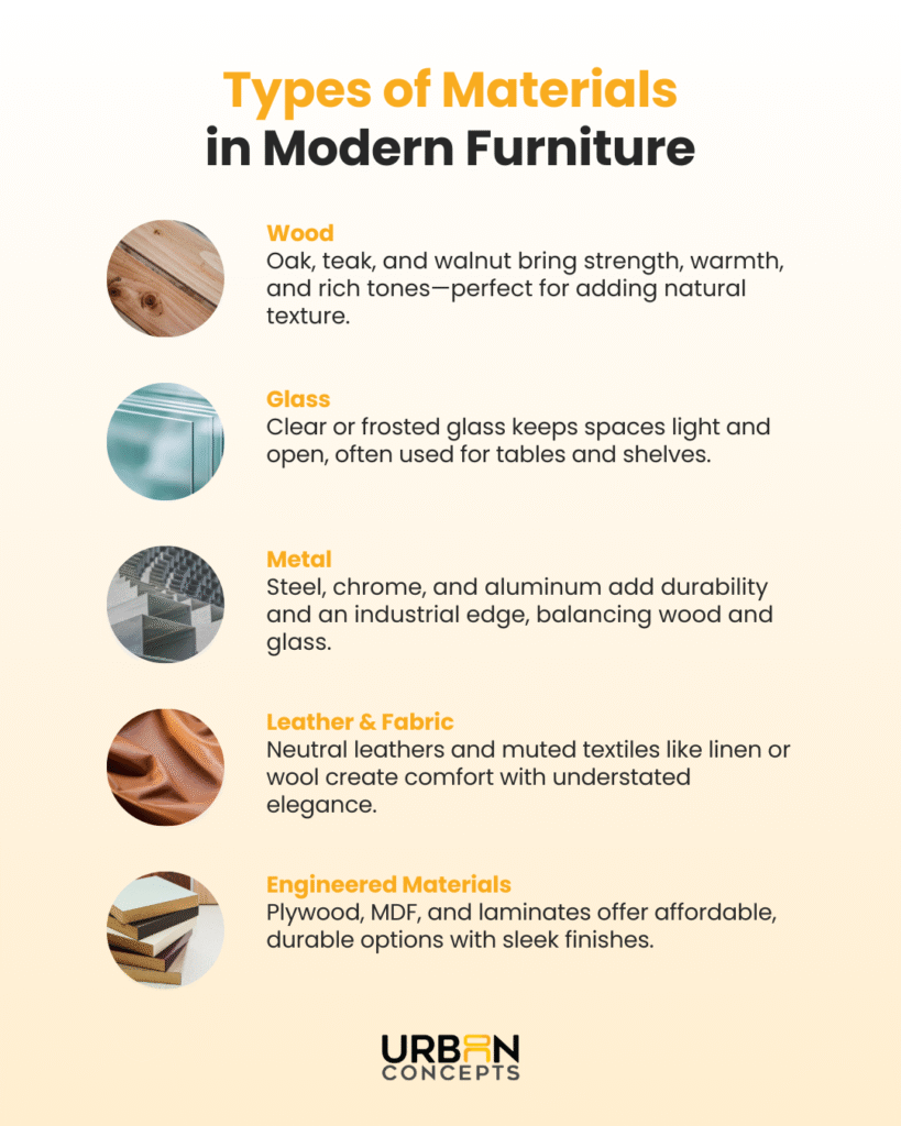 Modern furniture materials include wood (oak, teak, walnut), glass, metal, leather, and engineered materials like MDF or plywood, chosen for both style and durability.