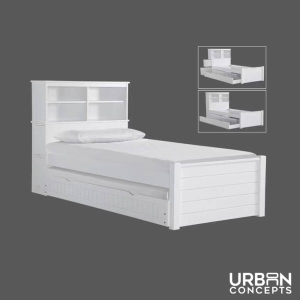 Just right for sleepovers with friends, visiting relatives, or even a pajama party with mom and dad, the Beatrice Bookcase Bed with trundle offers a comfortable and convenient sleeping arrangement with additional storage in the headboard itself.