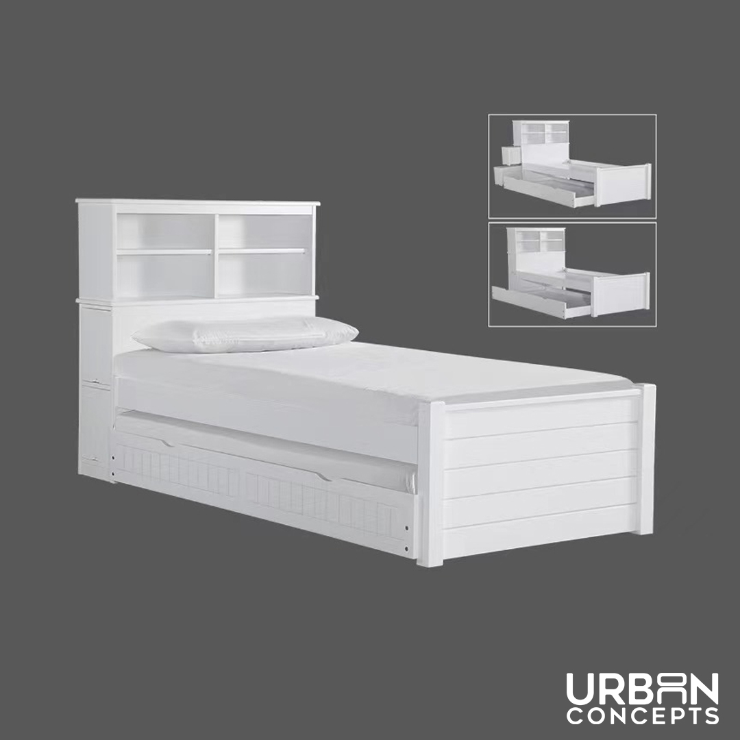 Just right for sleepovers with friends, visiting relatives, or even a pajama party with mom and dad, the Beatrice Bookcase Bed with trundle offers a comfortable and convenient sleeping arrangement with additional storage in the headboard itself. Perfect for children’s rooms or guest rooms. This bed requires two single-size mattresses, not included. We suggest two single mattresses that are 4-6″ thick so that some of the bed frames will still show.