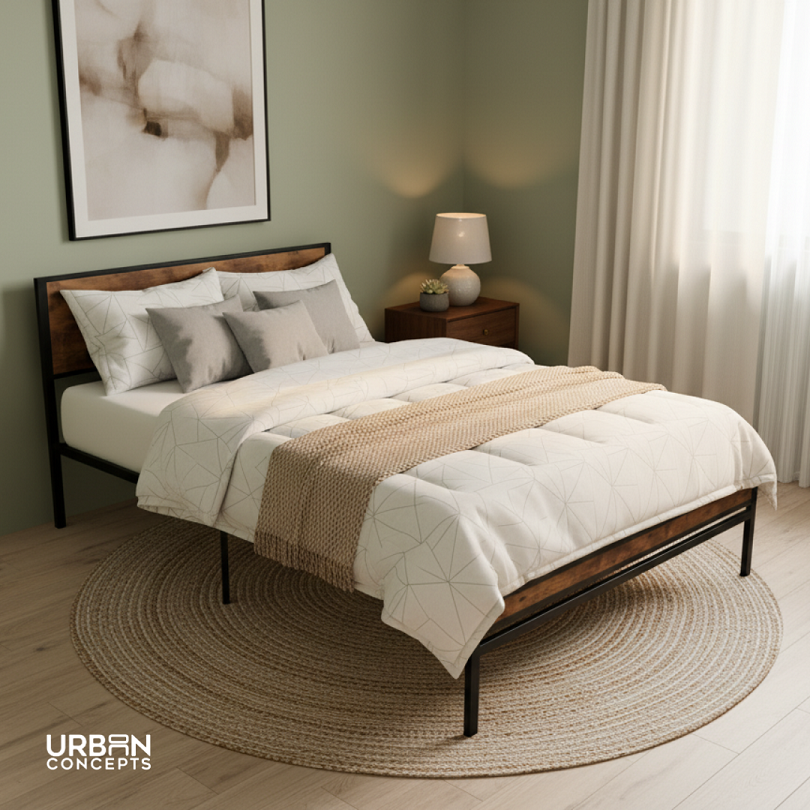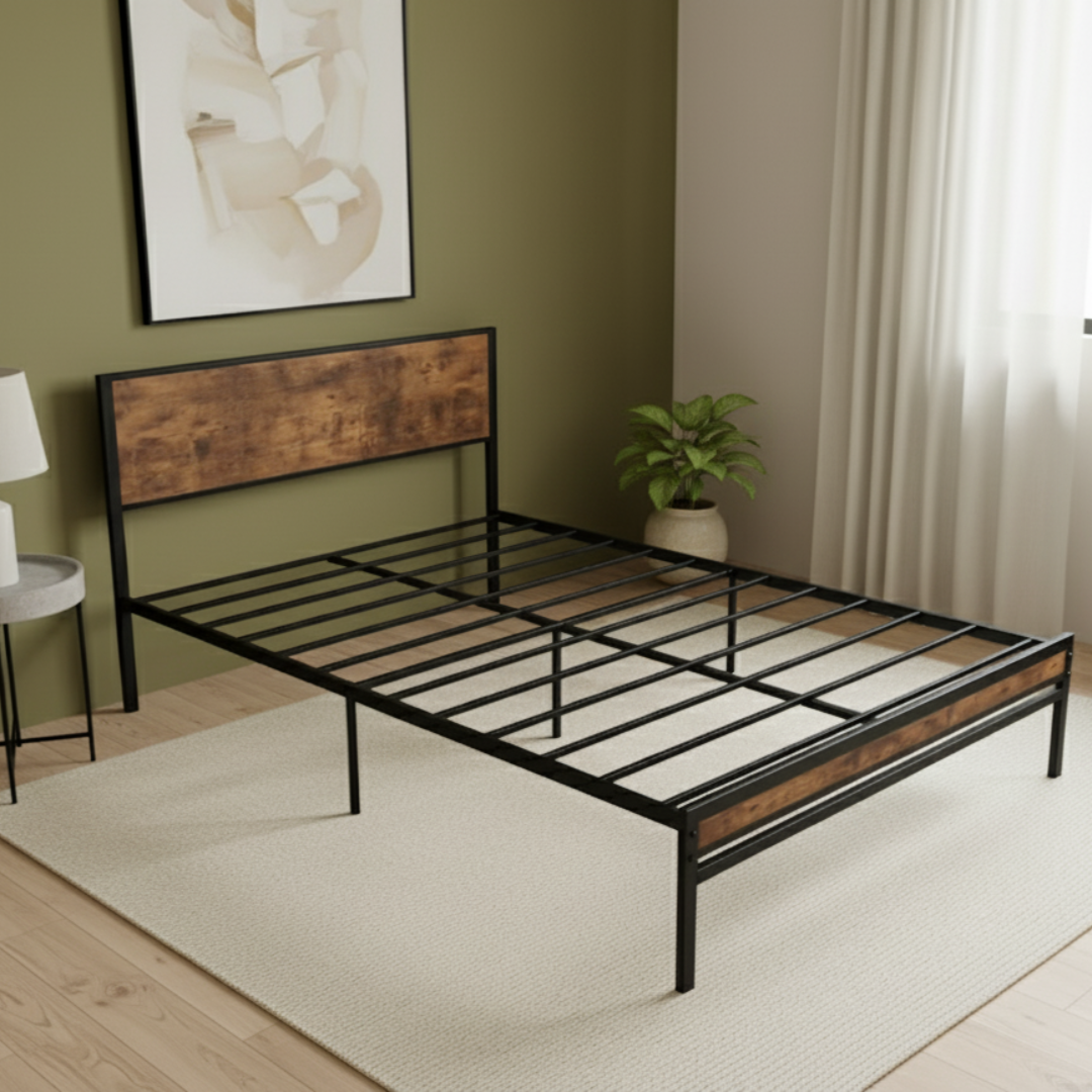 Transform your bedroom with the sleek and modern Becca Bed Frame — where industrial style meets everyday comfort. Designed with a sturdy black metal frame and complemented by warm walnut wood-finish panels on the headboard and footboard, this bed adds a touch of contemporary elegance to any space.
