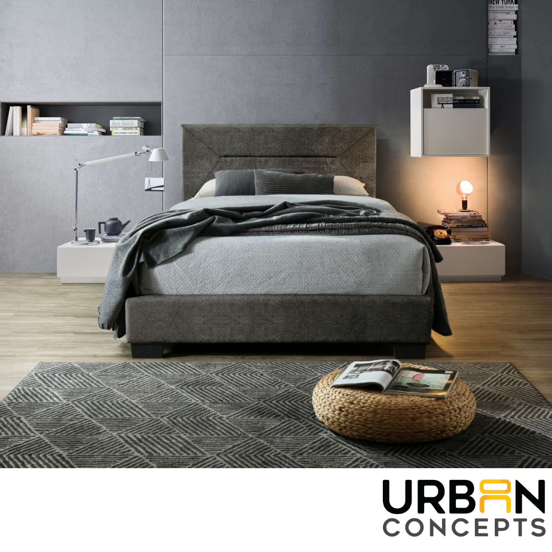 - The dark grey fabric upholstery is not only on-trend, but also easy to maintain and clean.