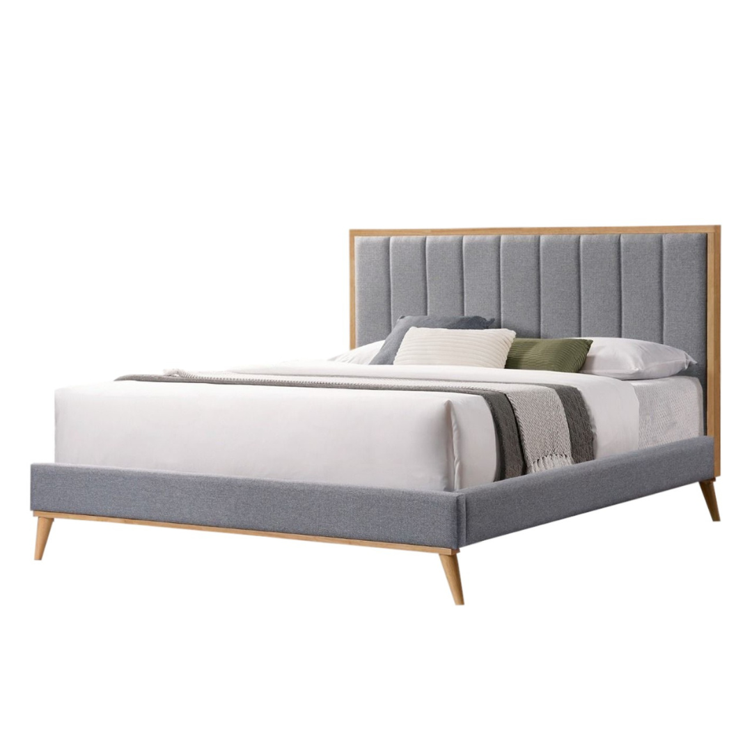 This Blaze bed is suitable for double and queen-size mattresses and upholstered in stone-colored linen with a vertical channel tufted headboard. It has foam padding, slanted solid rubberwood legs, and a Scandinavian design, making it versatile for any room decor.