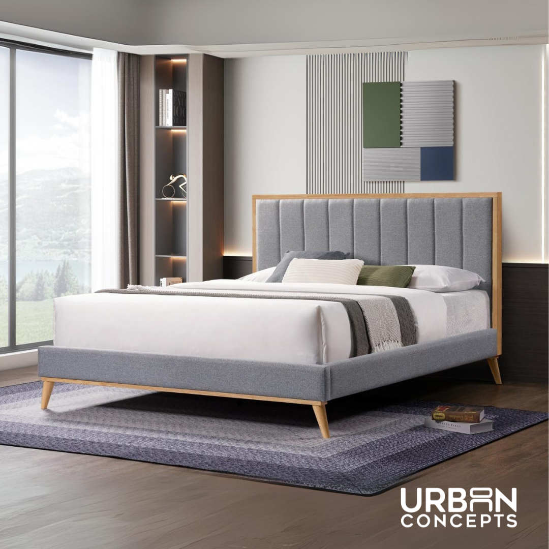 - Materials: Solid wood, MDF with upholstered foam and fabric headboard
