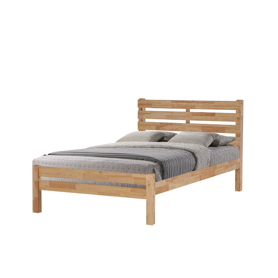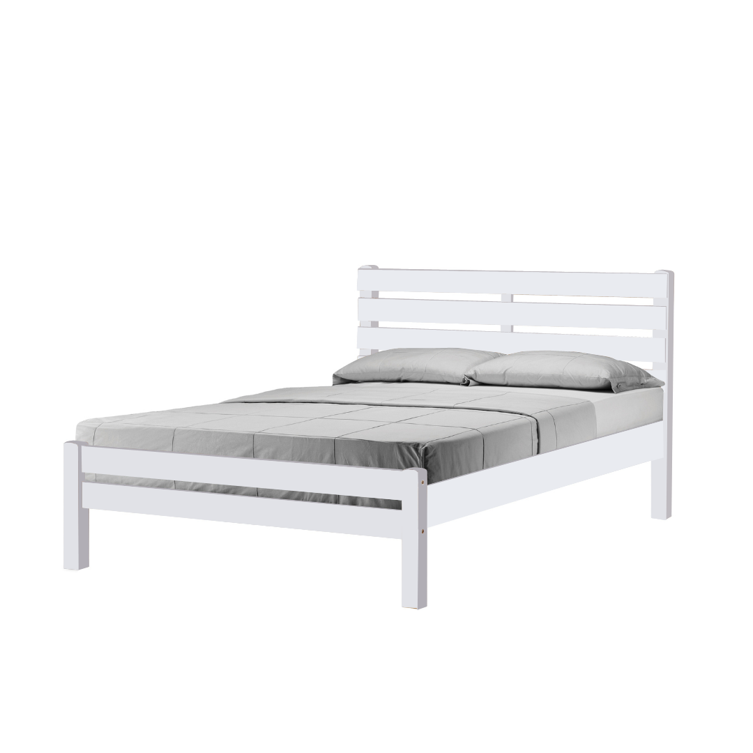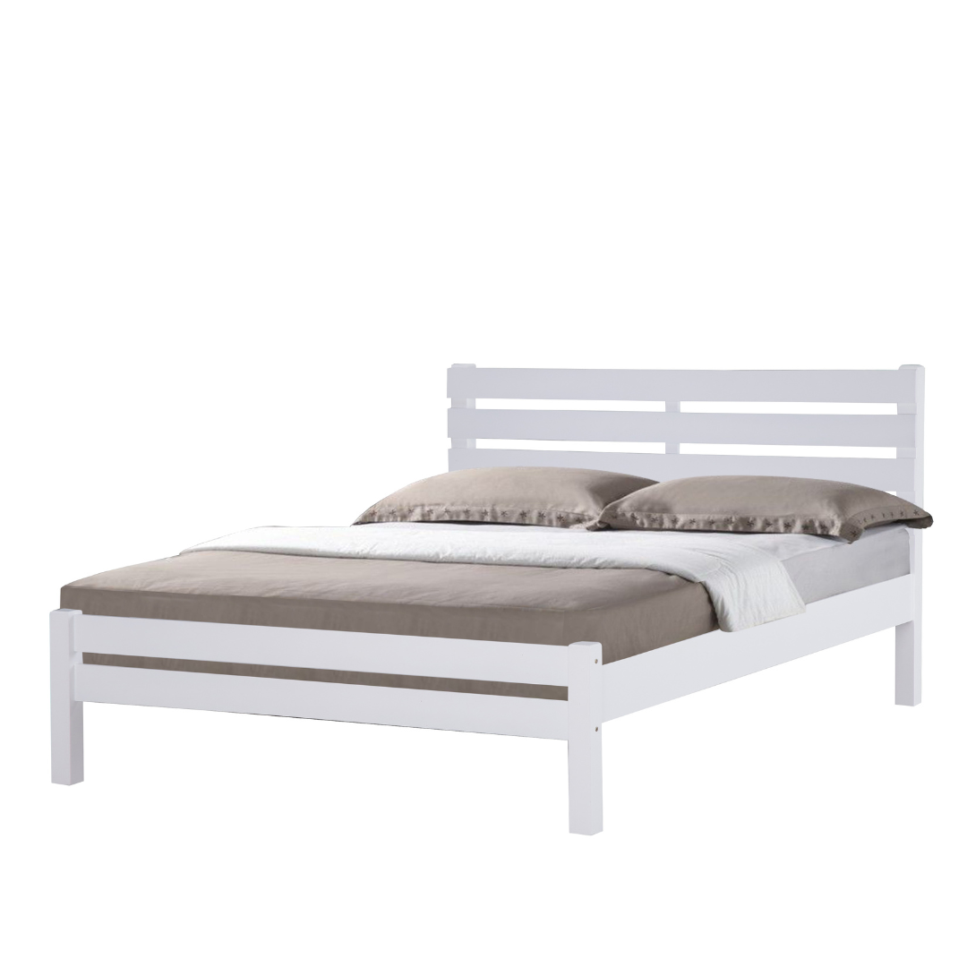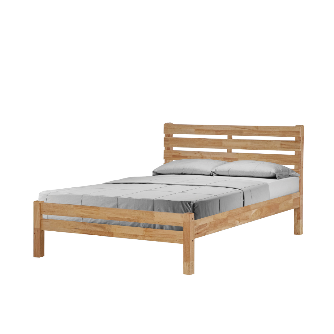 Introducing the Brazen bed frame that complements any bedroom decor with its clean and casual look. It features a wooden slatted headboard, and low-profile footboard, and is crafted with solid rubberwood and MDF side rails. You can choose from two colors: white and natural.