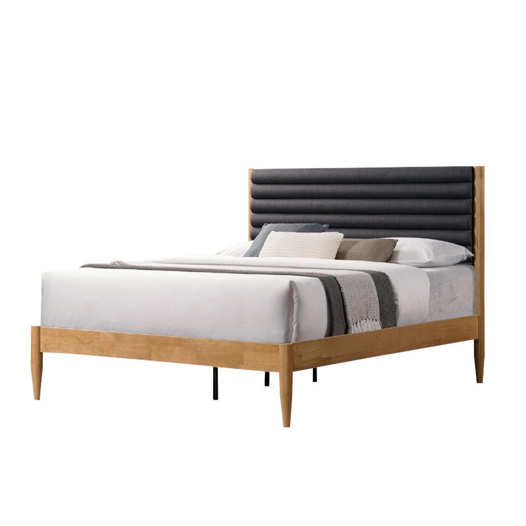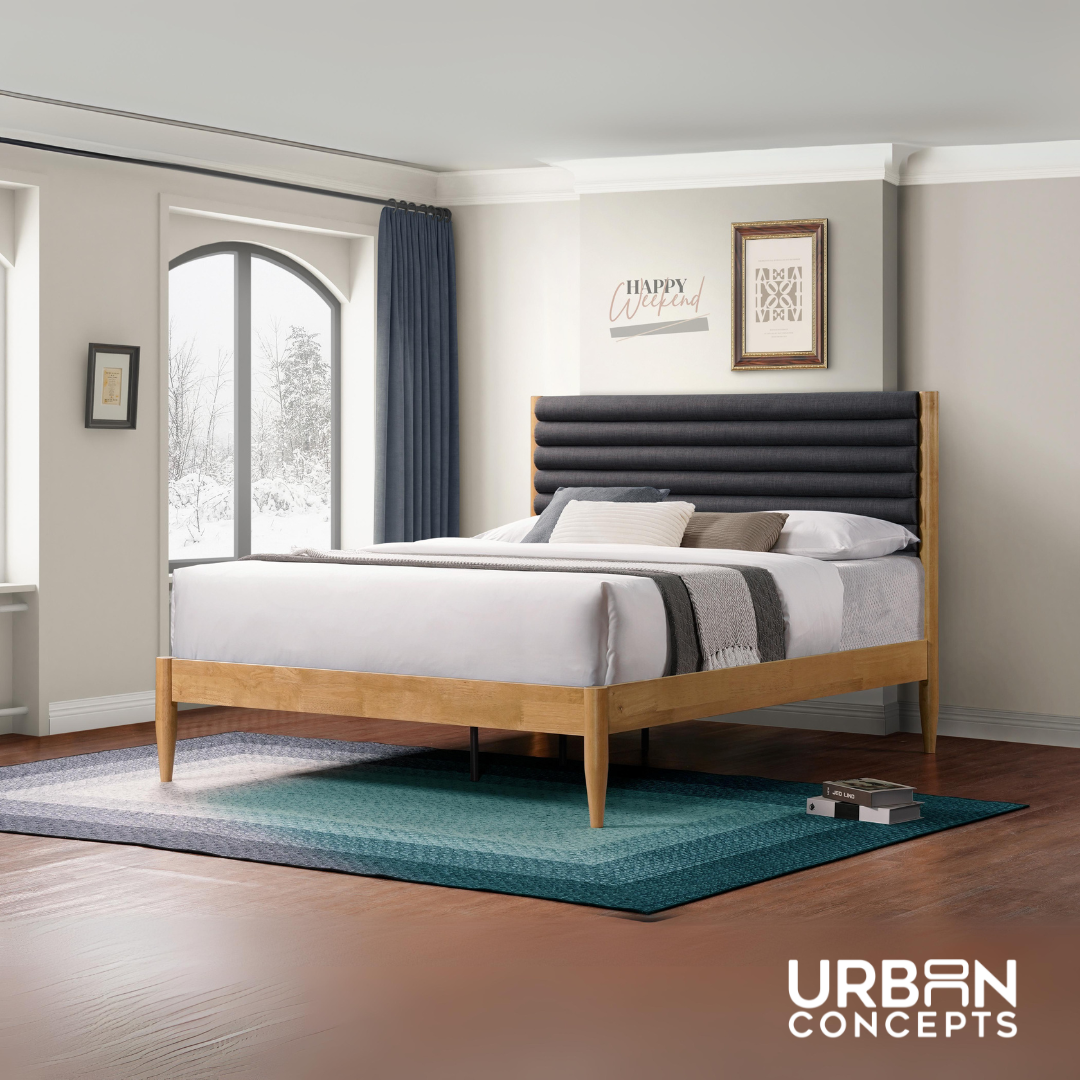 - Materials: Solid wood, MDF with upholstered foam and fabric headboard