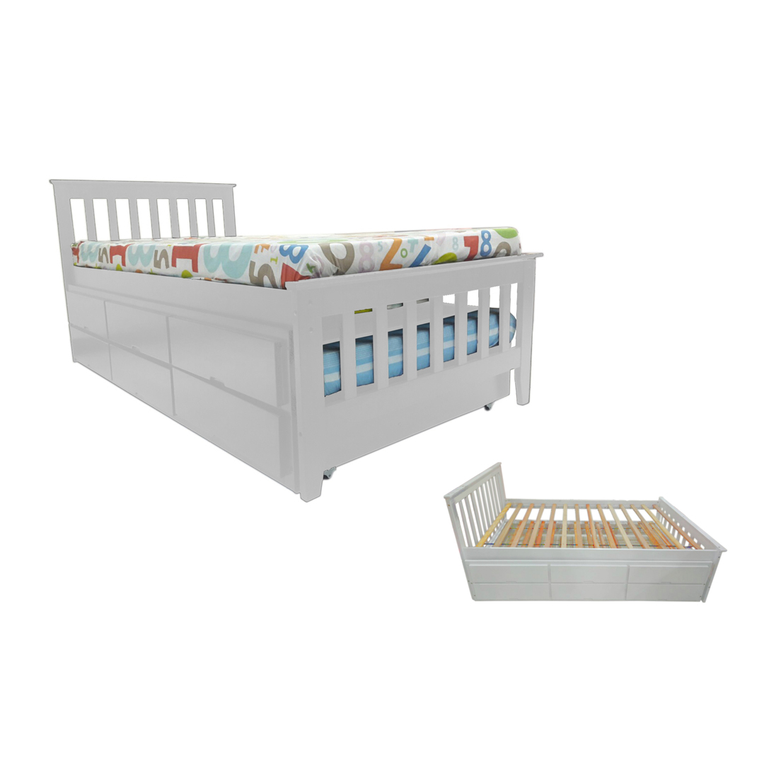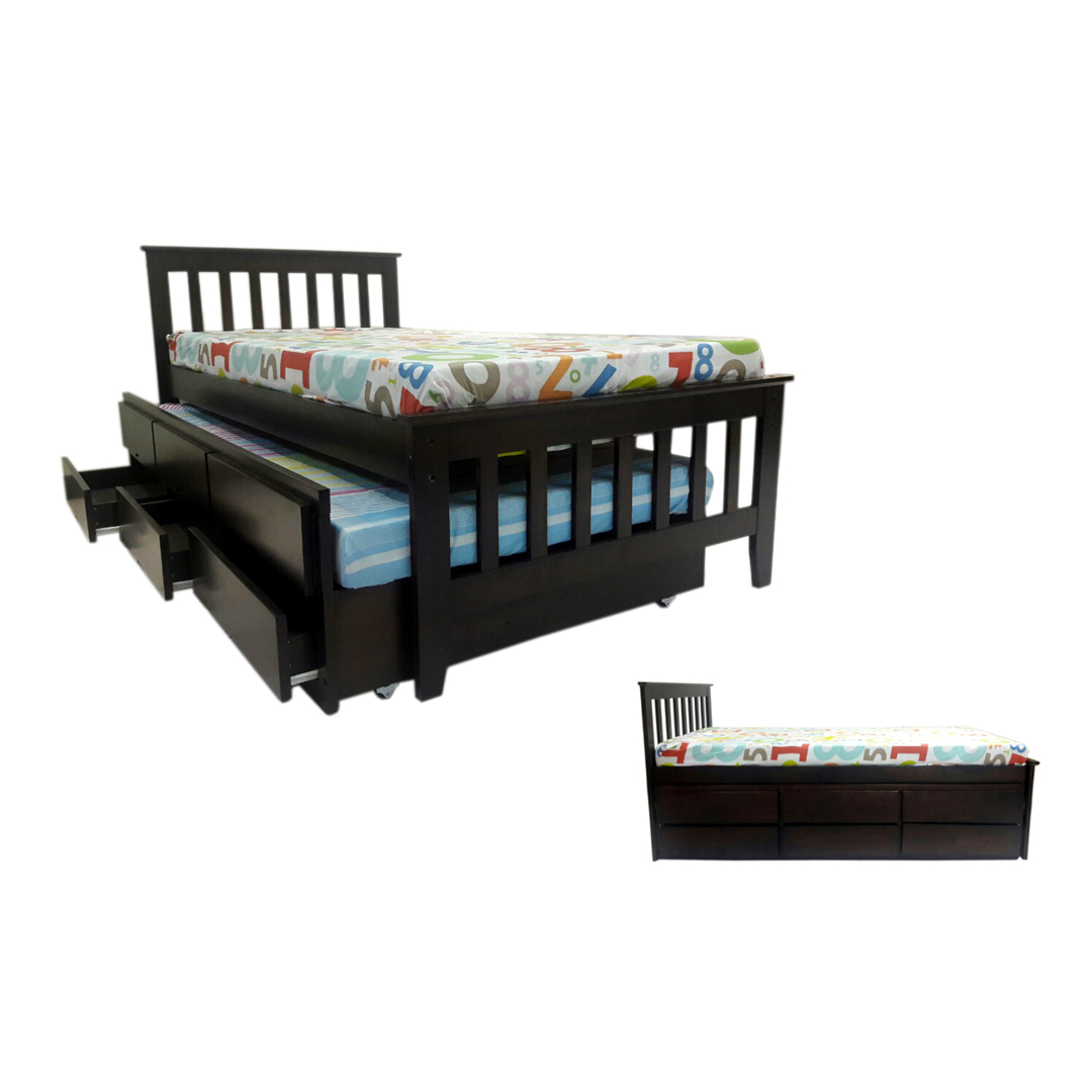 The Brody trundle bed is a space-saving wood bed with one pull-out and three drawers. Store your pillows and blankets below and have your essentials near. Perfect for children’s rooms or guest rooms. Single and twin sizes available.
