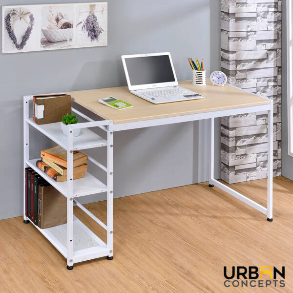 The Cadoc computer desk boasts a stylish design with an MDF-PVC material in a beautiful beech wood color. The main frame has a sleek white coating, while the iron shelves are supported by chrome and iron tubes for added durability.