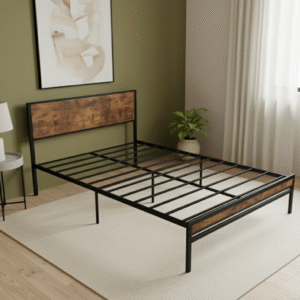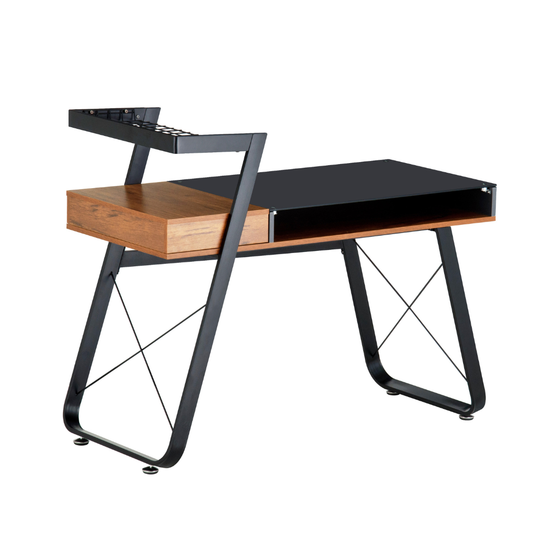 Crafted with a powder-coated metal frame and bold angular legs with cross-bracing, the Calvin Computer table offers superior stability and industrial charm. A spacious pull-out drawer keeps essentials tucked away while the elevated side rack adds extra room for organizing accessories, gadgets, or décor.