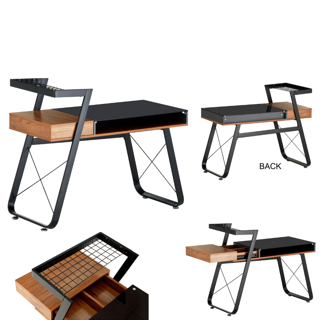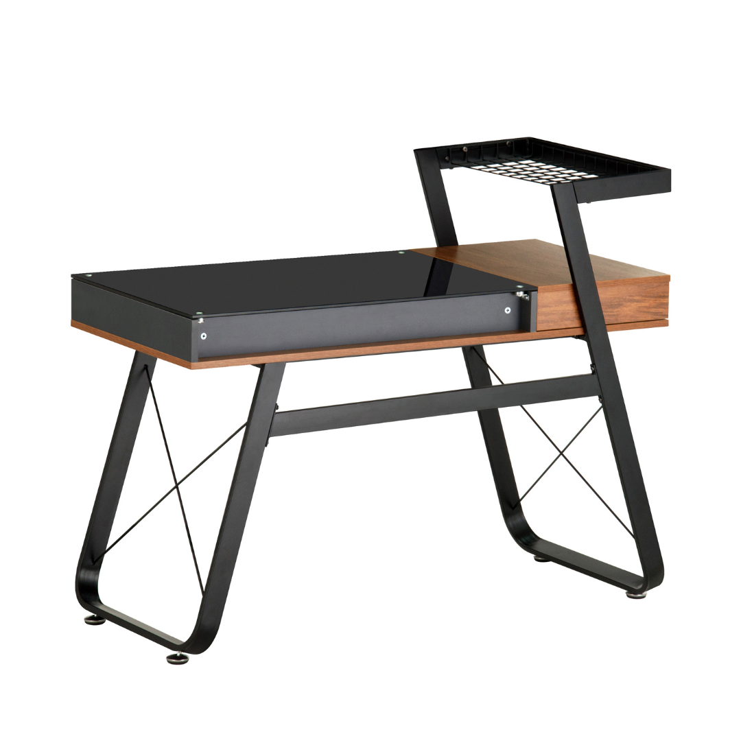 Sleek, compact Calvin Computer Table: fuse style and functionality. Premium black tempered glass top with dark pine wood finish. Sturdy metal frame, angular legs, powder-coated. Pull-out drawer, elevated side rack for storage and organization.