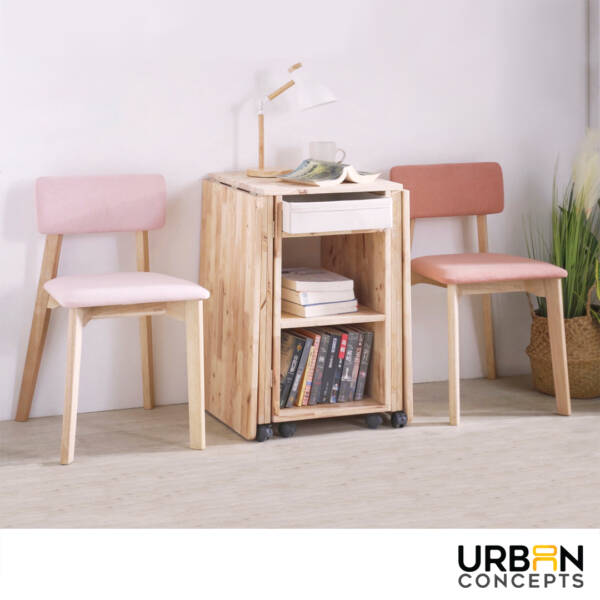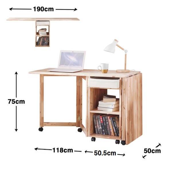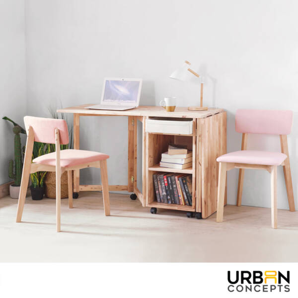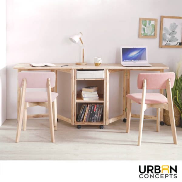 Cole study desk is a cute space-saving desk that is made from rubberwood boards equipped with two foldable desks, two shelves to store books and a fabric box. Two persons can work at the same time and folds away neatly to save space when not in use. Chairs are not included.