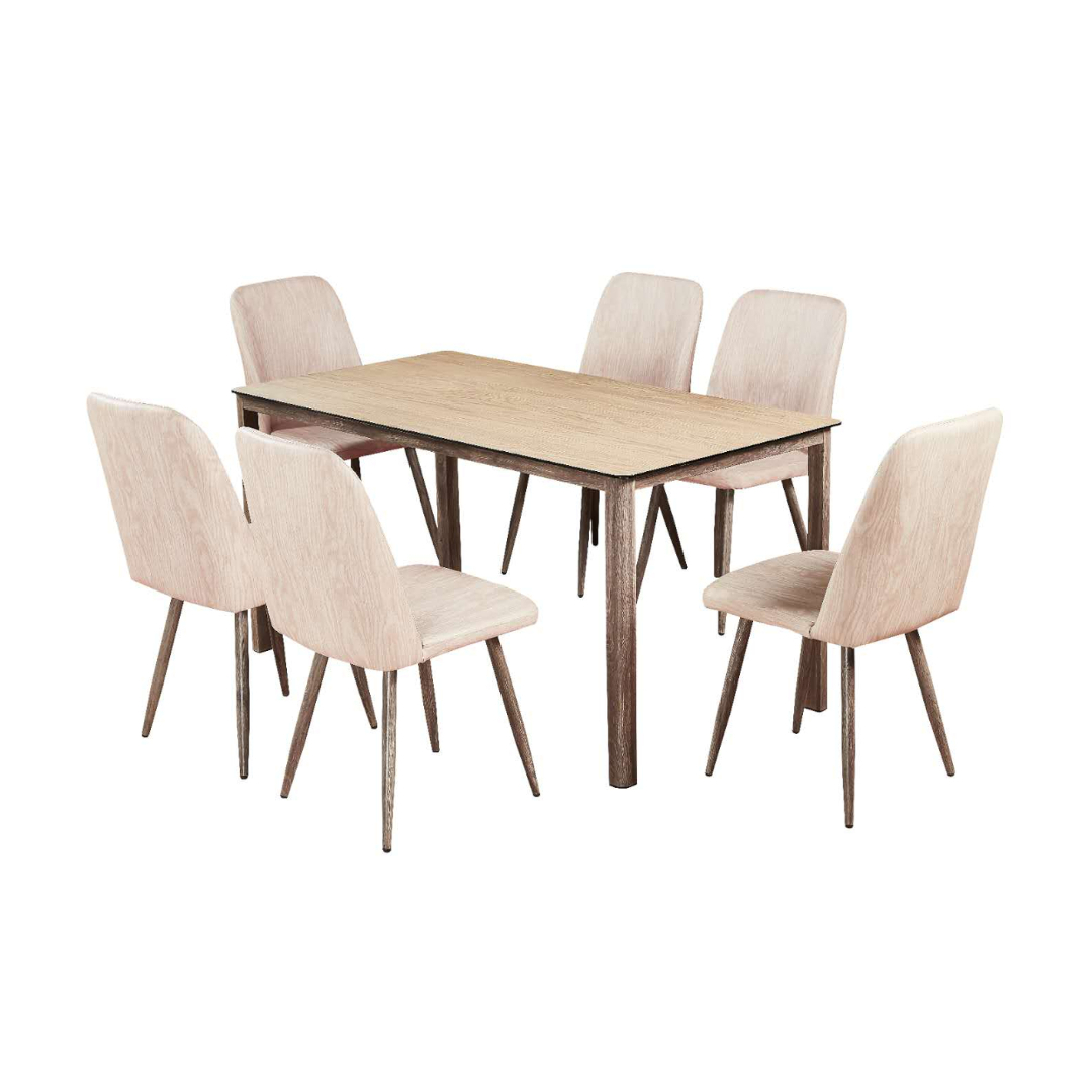 The Daniela table features a 10mm enameled glass top in camel finish, supported by wood grain legs in golden oak finish. The accompanying chairs are made of PU leather and feature matching wood grain legs.