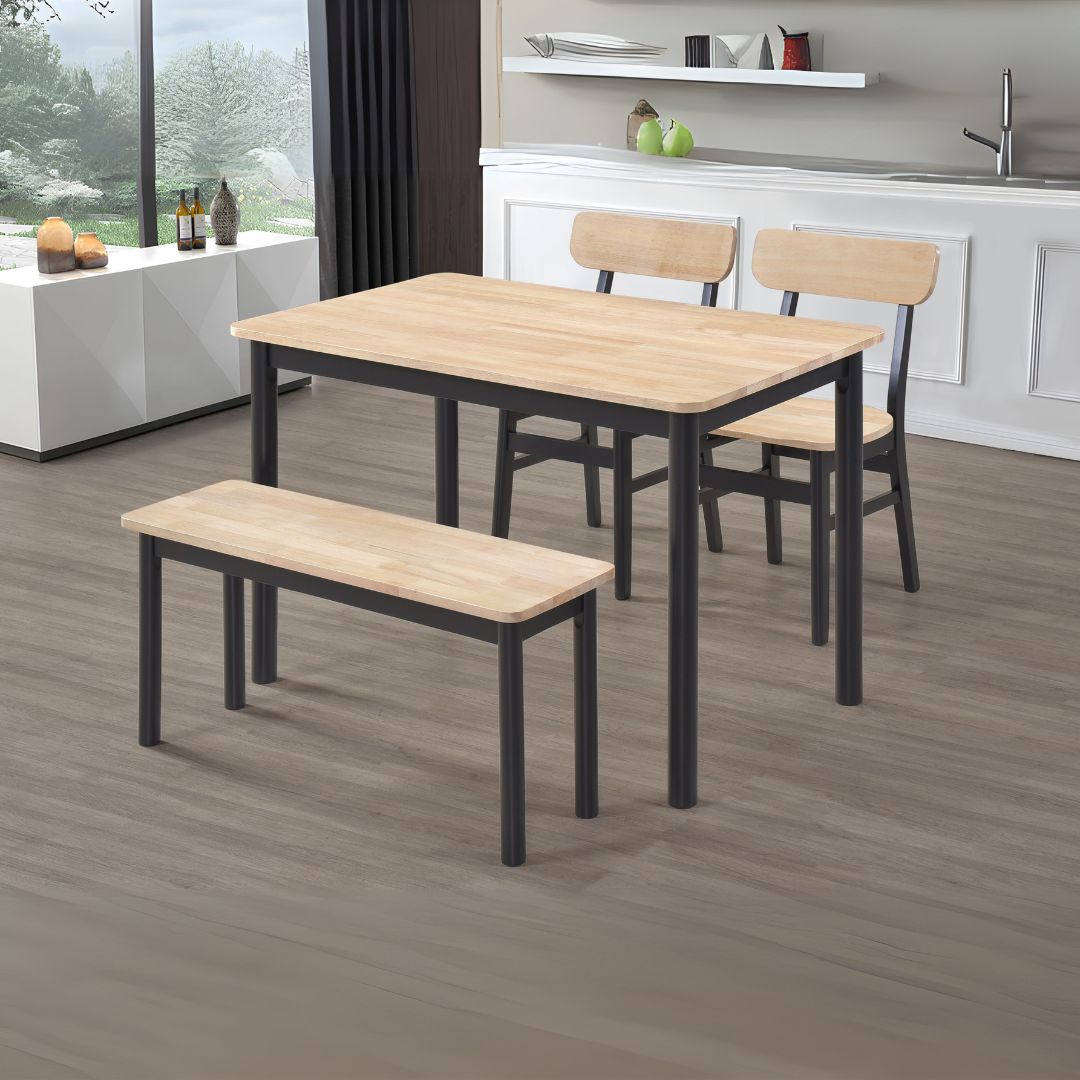 Introducing the versatile and stylish Dawn Dining Set with Bench! Perfect for small spaces, this set includes a wooden table, two chairs, and a bench that seats four. The sturdy, solid wood frame is durable and elegant, supporting significant weight. Whether dining, working, or studying, this set is perfect for modern living.
