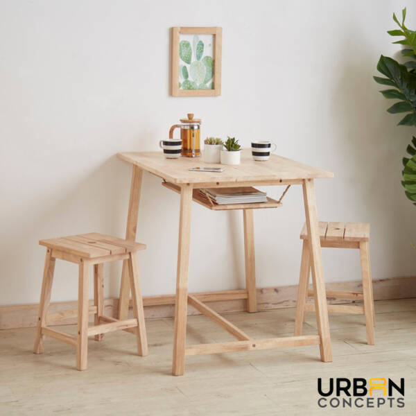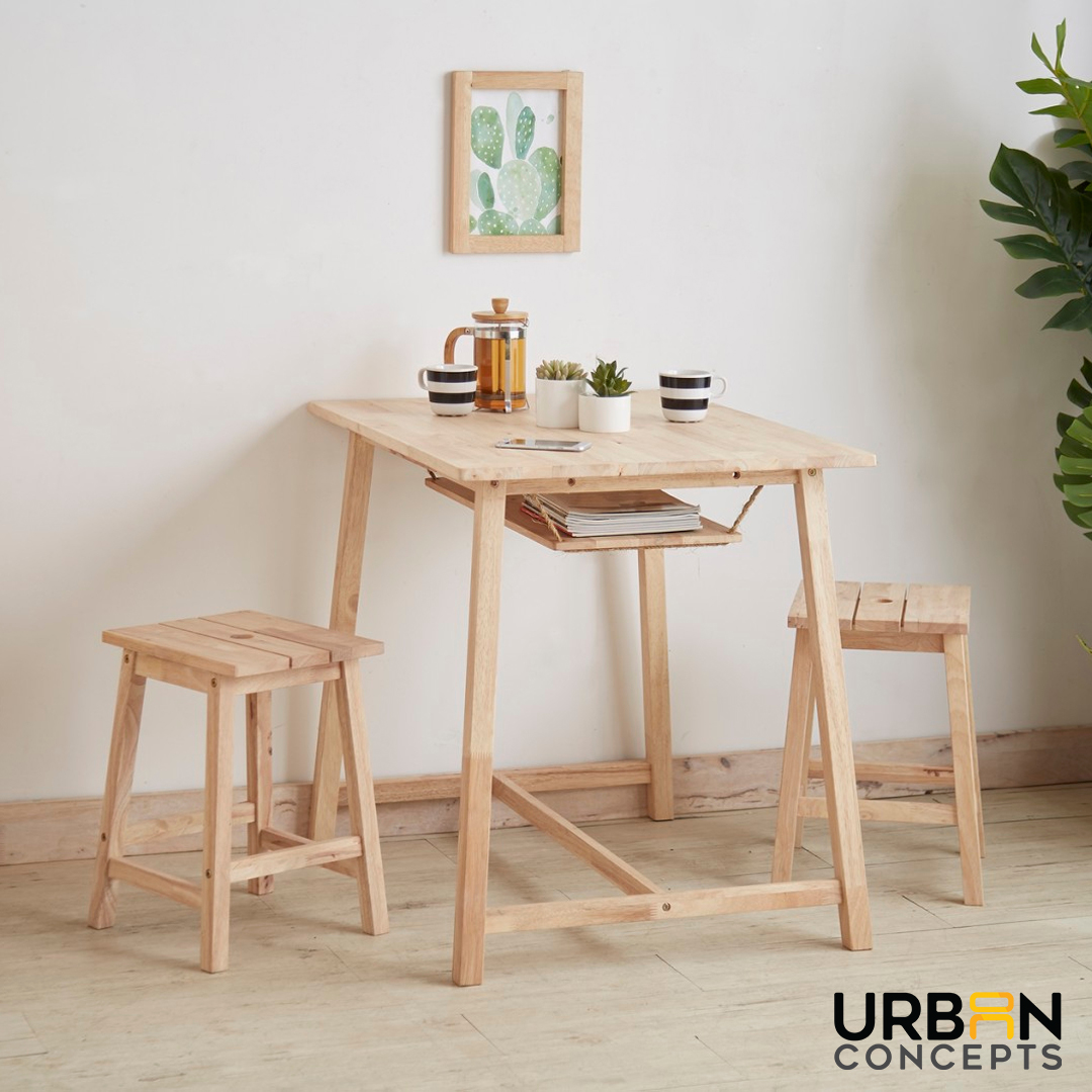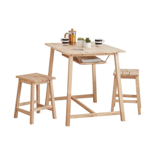 Enhance your dining area with our Deacon Dining Set. This beautifully crafted set comes with a square table and two stools, perfect for any kitchen or dining space. The table features an inner hanging shelf, which can be used to store magazines or other items while you dine.