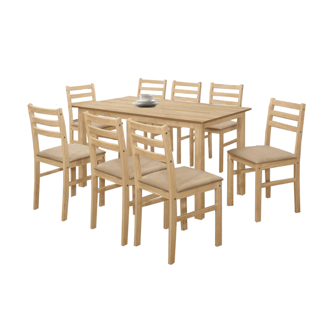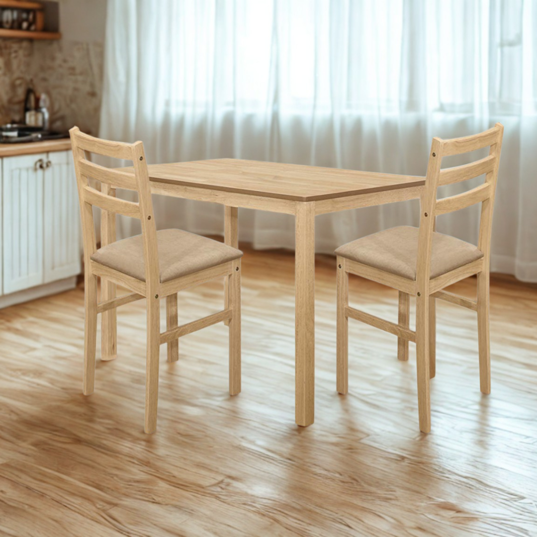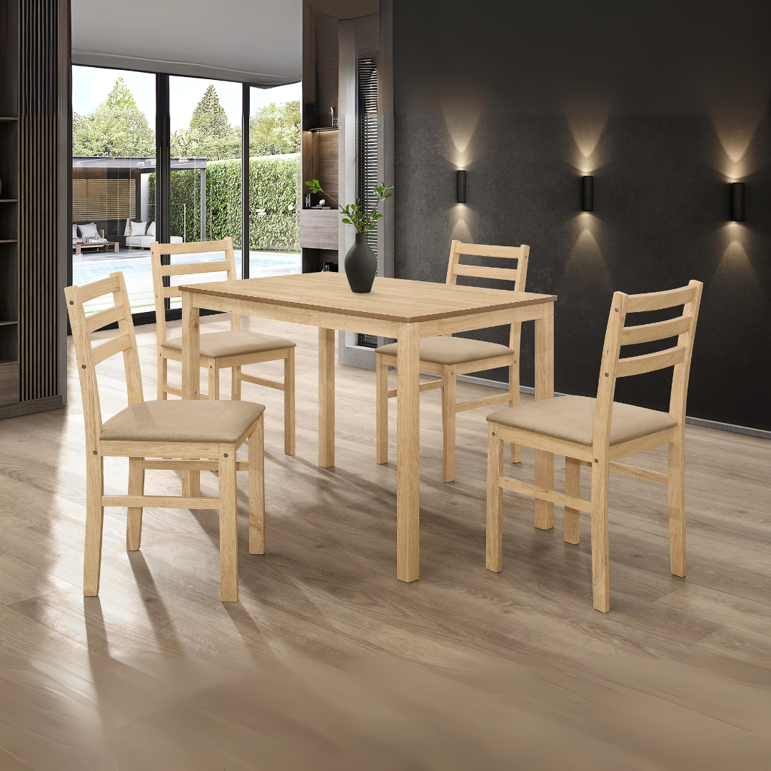 Crafted from 18mm MDF with a rubberwood veneer top and available in both rich Antique Oak and fresh Natural finishes, this set is designed to complement any décor. The ladder-back chairs feature plush cushioned seats that ensure comfort during every meal, from weekday breakfasts to festive celebrations.
