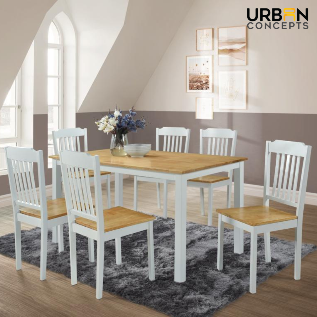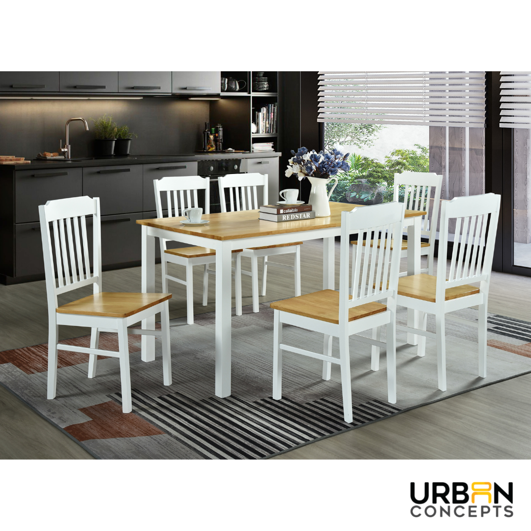 Bring style and comfort to your dining area with our modern-style dining set. The dining table boasts a two-toned solid rubberwood construction, complete with a planked top and apron. It also includes six slatted back chairs with slightly curved angles throughout, in a two-toned color finish. This Doreen Dining Set provides the perfect setting for enjoying meals with your family.