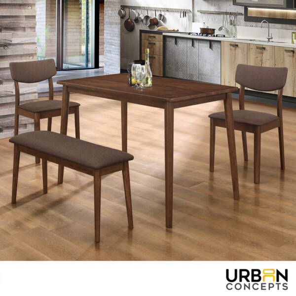 Elevate your dining space with this sleek and functional Drew 4-Seater Dining Set, designed for both style and comfort. Crafted with a solid wood table in a natural finish, this set brings warmth and elegance to any home. The combination of a bench and cushioned chairs offers versatile seating, perfect for family meals or casual gatherings.