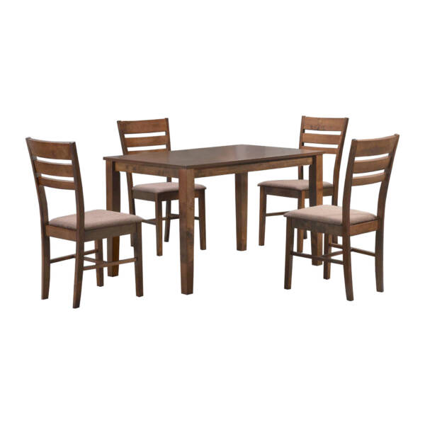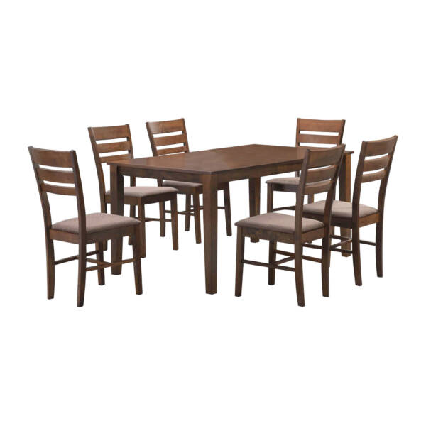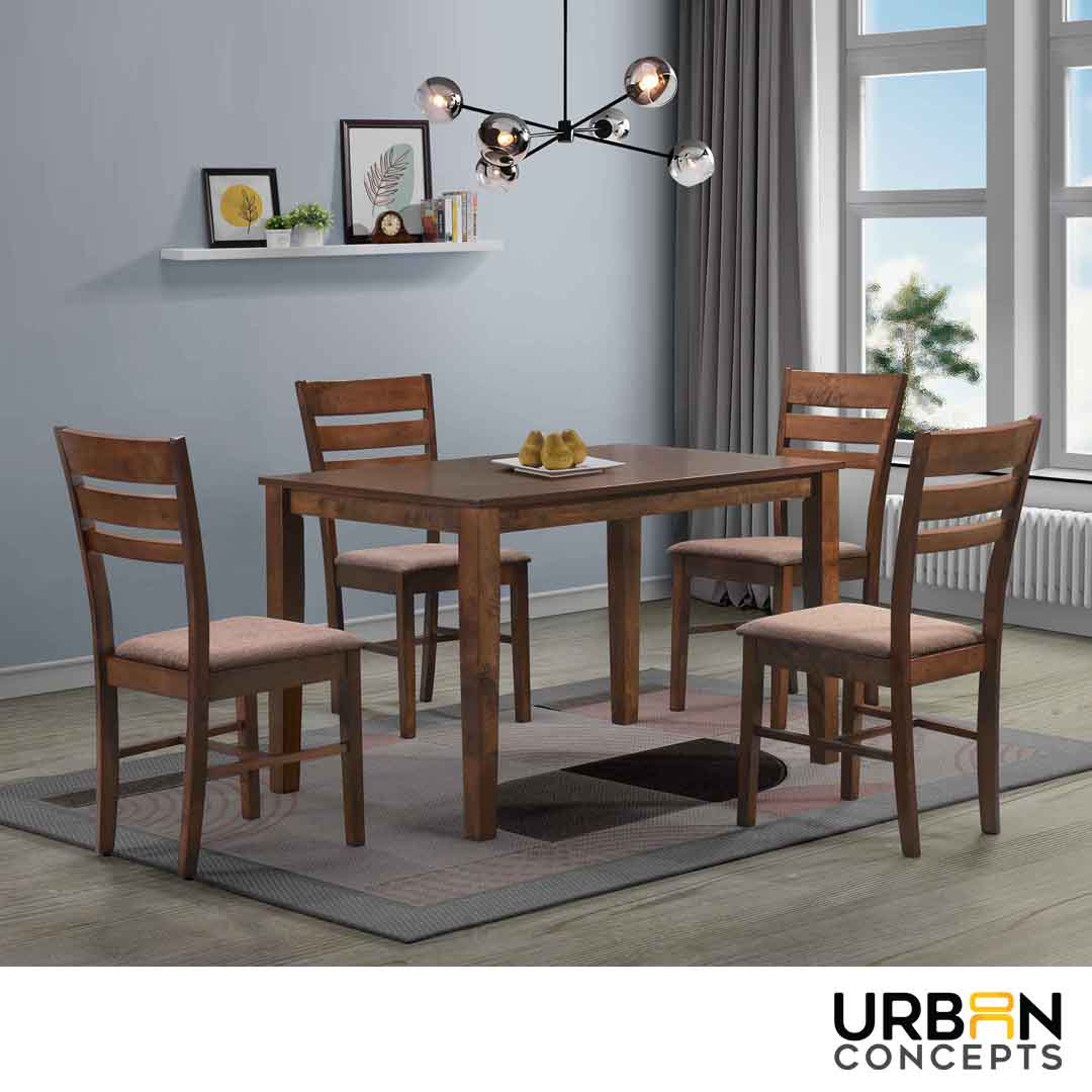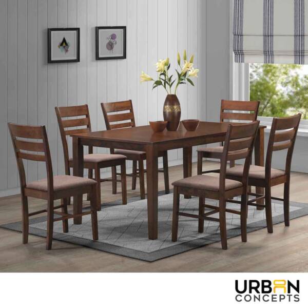 The Dustin dining set has a solid wood feel and soft cushions for comfortable seating. Available in 4-seater and 6-seater.