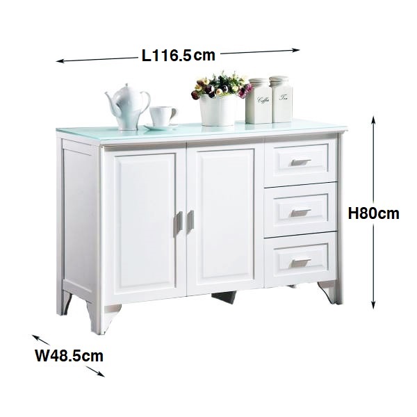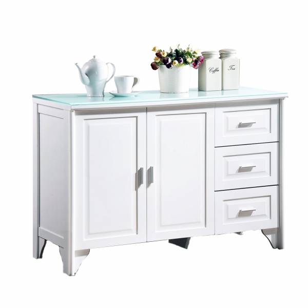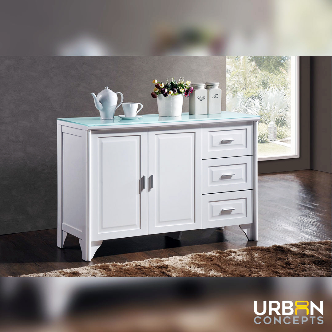 This Katrice kitchen cabinet allows you to conveniently store your dishware and dining accessories to this versatile kitchen cabinet, that features white high glossy MDF lacquered with 2-door and 3 storage drawers for contemporary and innovative storage space.
