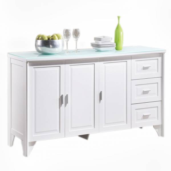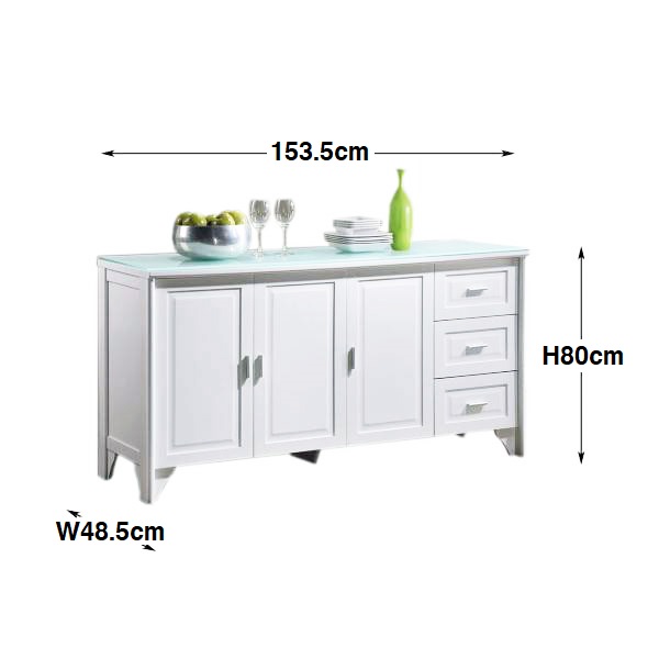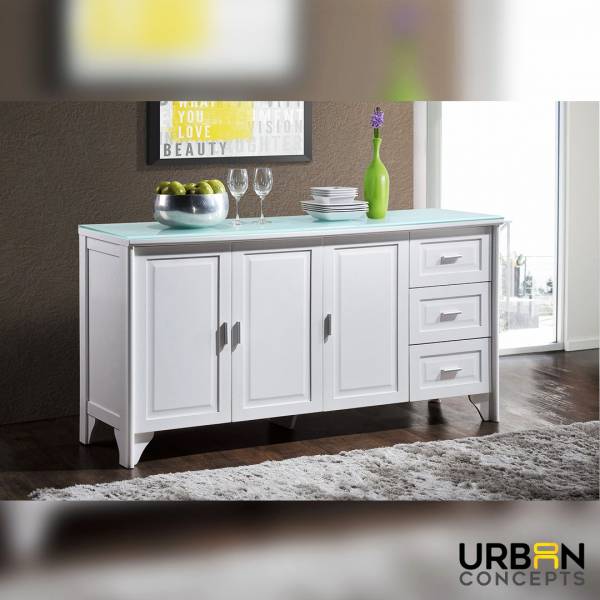 Perfect your modern dining room with this Kendra kitchen cabinet, which can also double as a sideboard. Features white high glossy MDF lacquered doors and 3 storage drawers to provide ample storage for all of your dining accessories. Table is topped with a thick tempered glass.