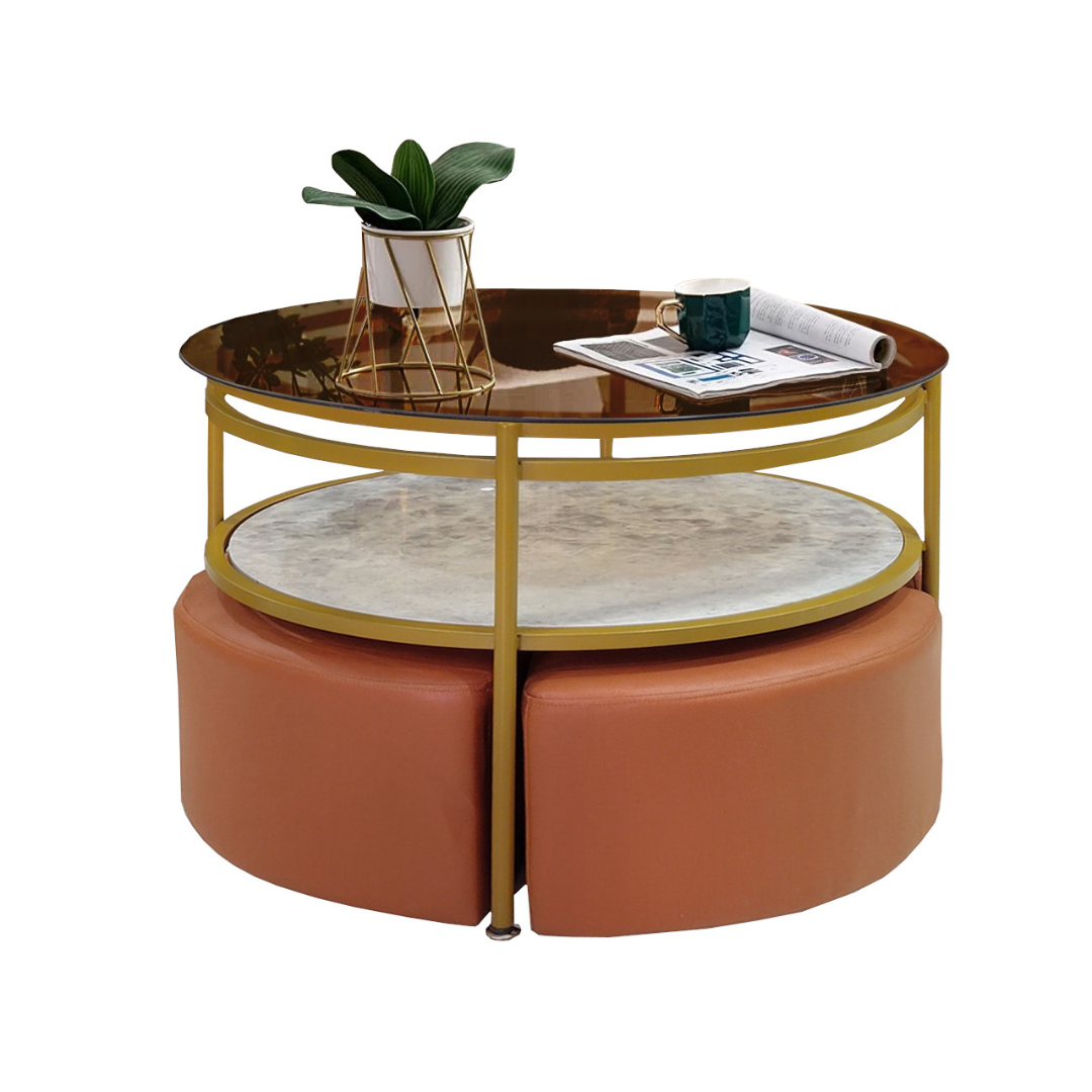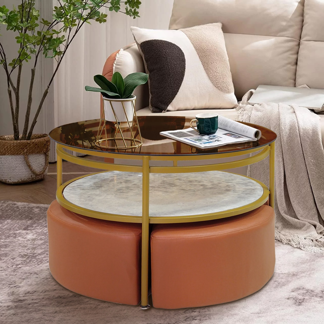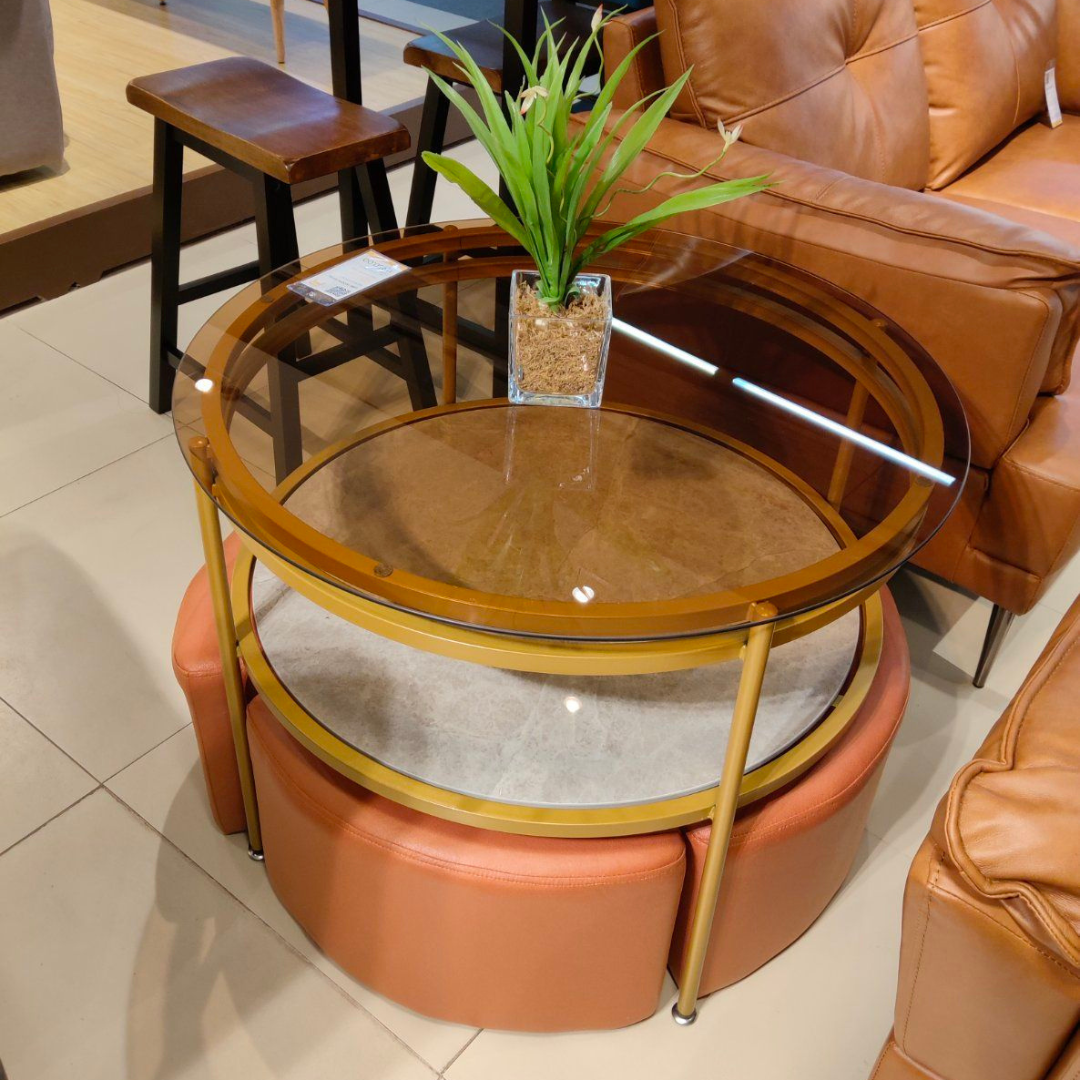 This is a modern round coffee table with seating stools. It has a strong steel frame for durability and a large glass and ceramic tabletop for storage. The product is safe for use in homes, offices, and hotels.