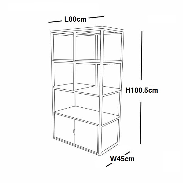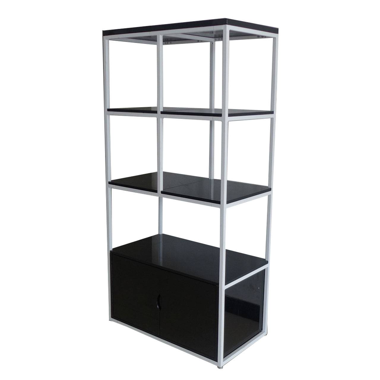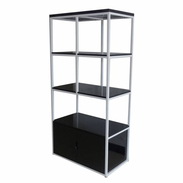 The Radi display cabinet is a tall multipurpose rack with two cabinets below and three shelves above. Store your memorabilia, books and other belongings in style with this elegant black and white piece.