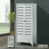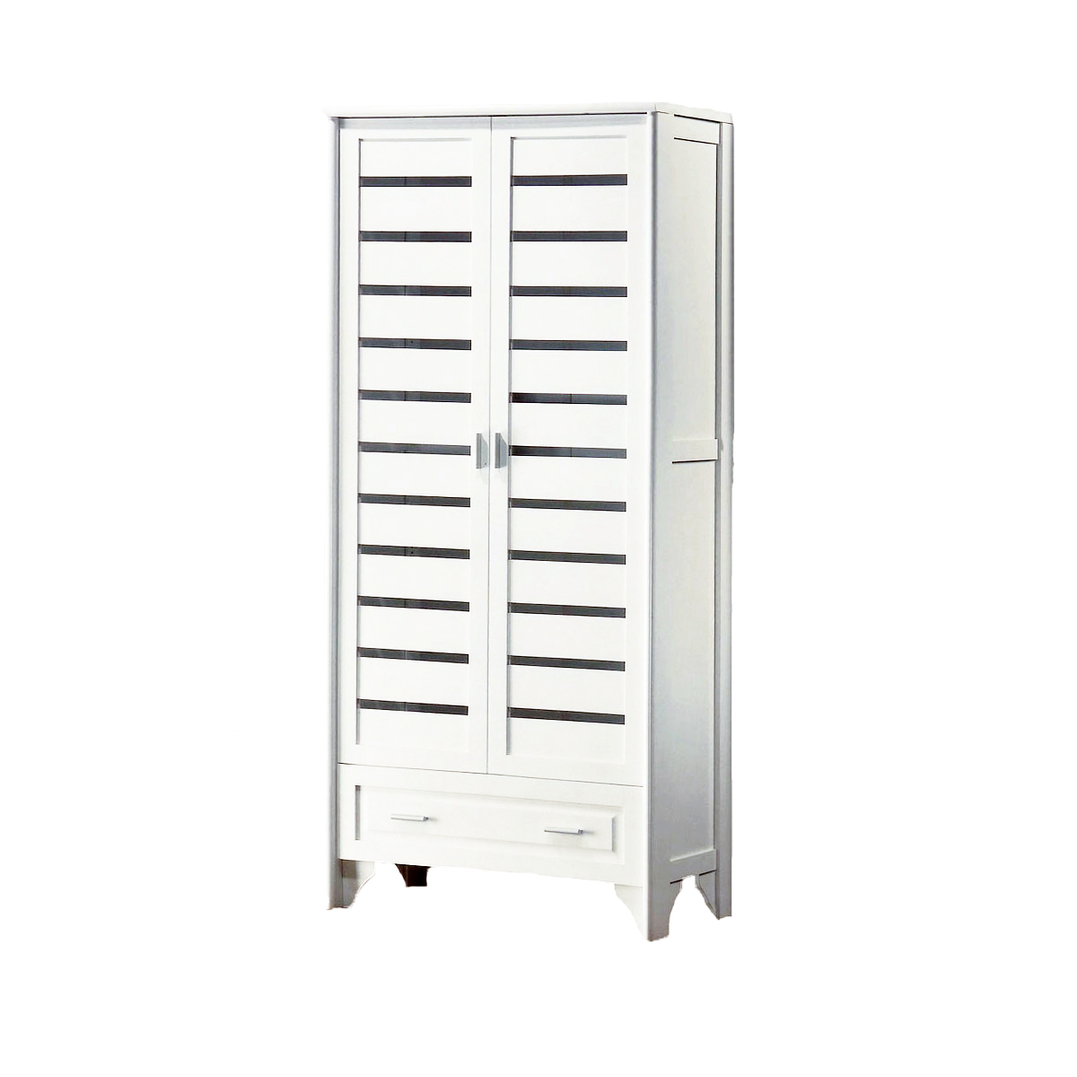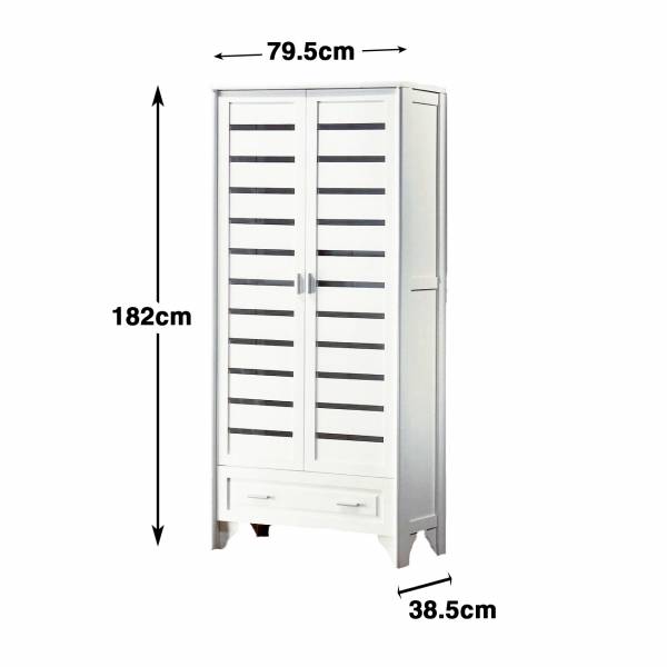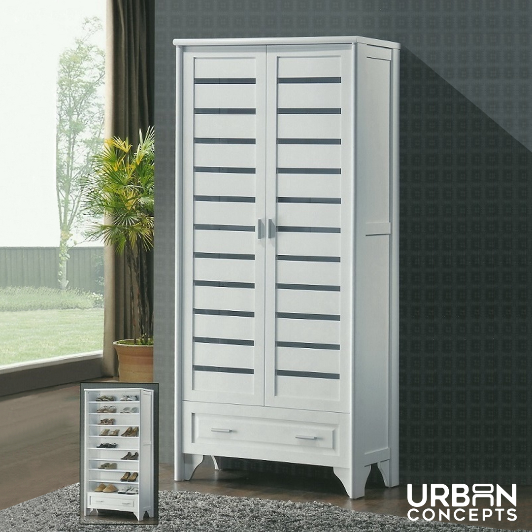 The Railey shoecase is 2-door white and one drawer with enough space inside to accommodate and keep your shoes neatly arranged. Start organizing your collection of shoes with this storage featuring white MDF, duco finish and metal handles. It features slatted doors and nine fixed shelves that stores up to 30 pairs of shoes.