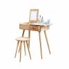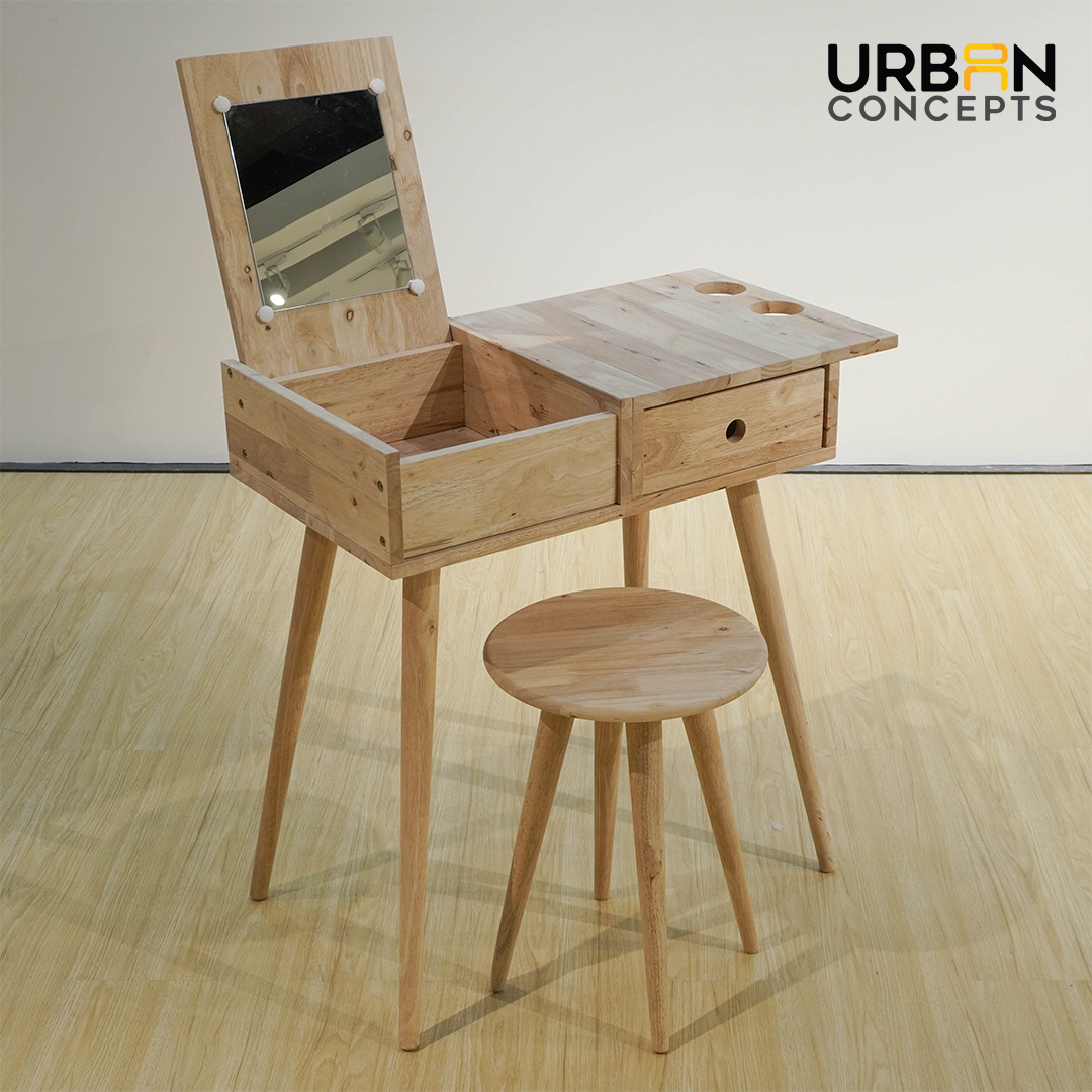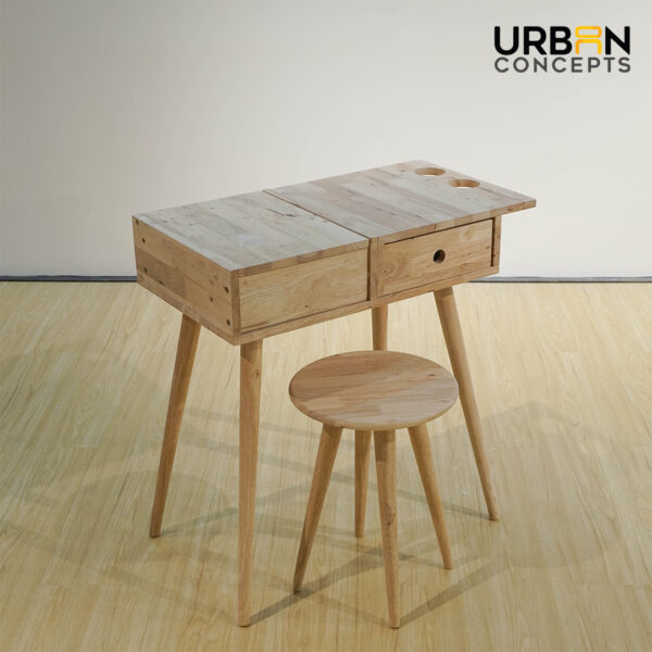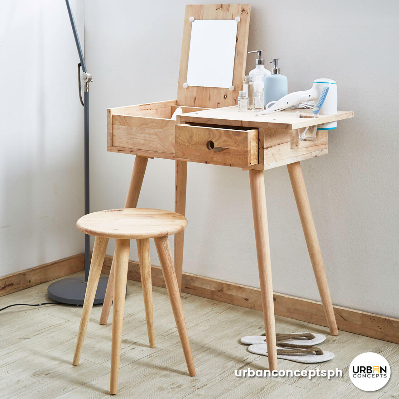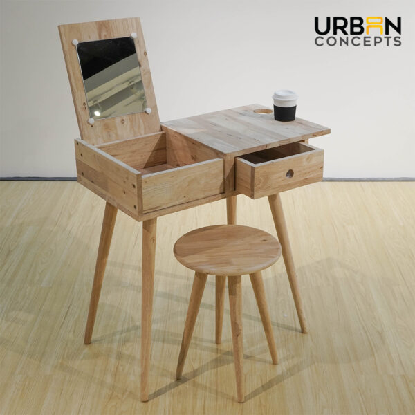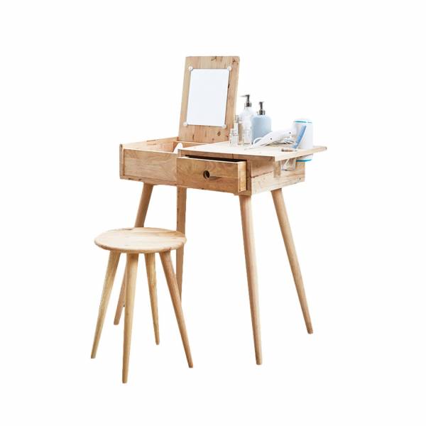 The Rainier dresser is a game-changer with its distinctive folding mirror, which not only saves space but also enables it to serve multiple purposes. Quickly fold the mirror back when not in use, and thanks to its compact and neutral design, you can place this piece anywhere in your room. Plus, it comes with a matching stool for added convenience.