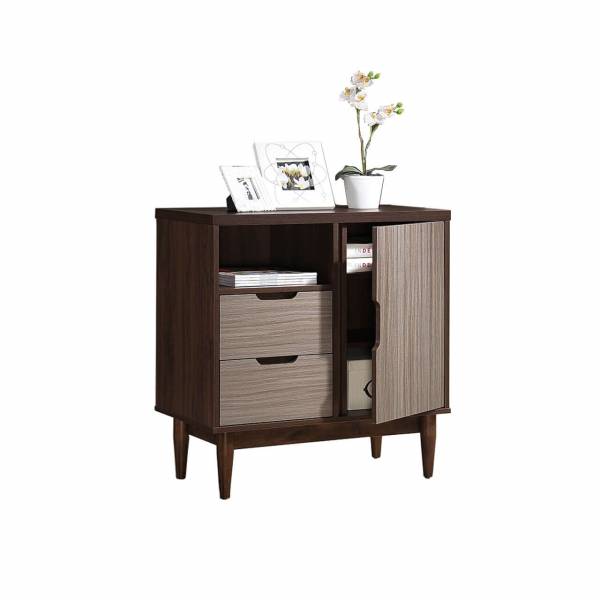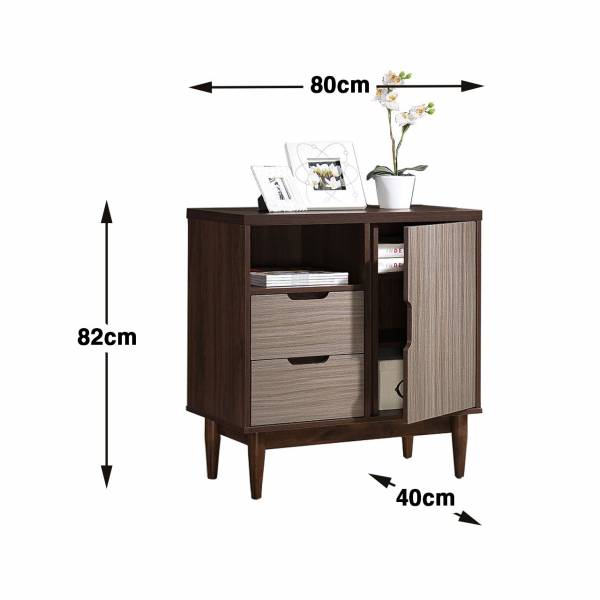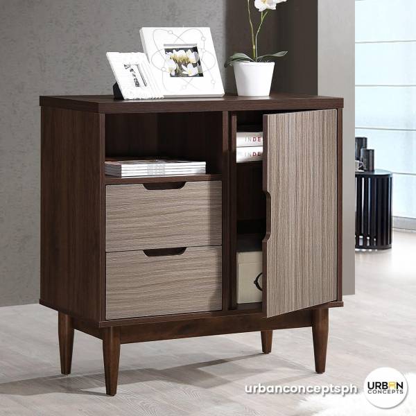 The Ravit display cabinet is part of our Zeniah collection, characterized by a combination of dark and light wood boards. This display cabinet is a cute little addition to your home, and it boasts lots of features too! Comes with a total of 4 shelves, 1 cabinet and 2 drawers to store your books, magazines and living room essentials.