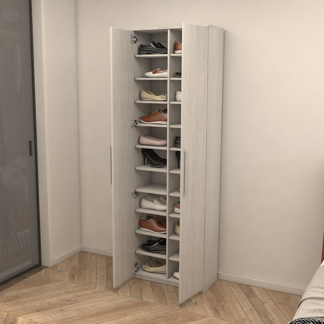 - The Rossie shoe cabinet can hold up to 22 pairs of shoes or sandals, depending on their size and shape. This is ideal for families or individuals who have a large collection of footwear and want to keep it neatly organized in one place.