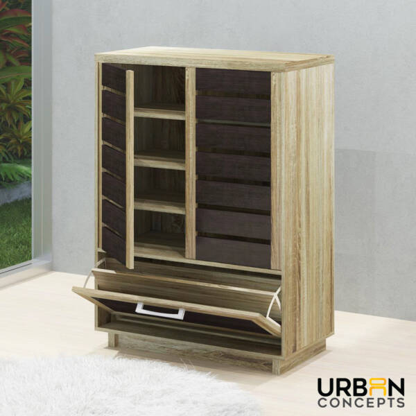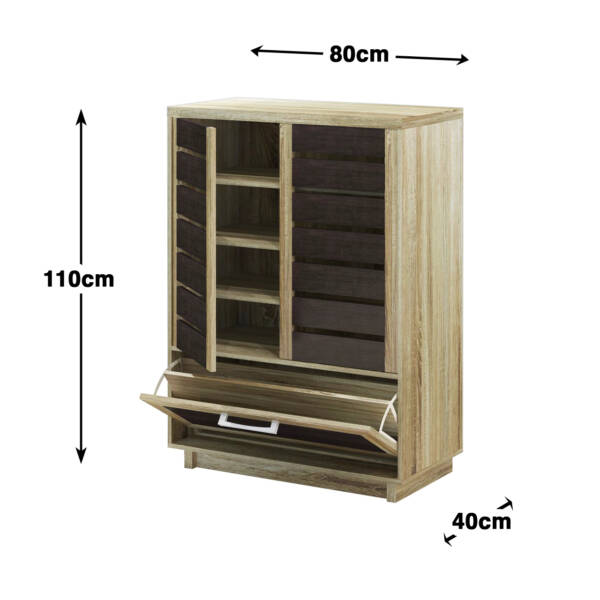This Roxie shoe cabinet features four shelves and one rotary door to reveal two fixed shelves, cabinet top can also be used as a display space.