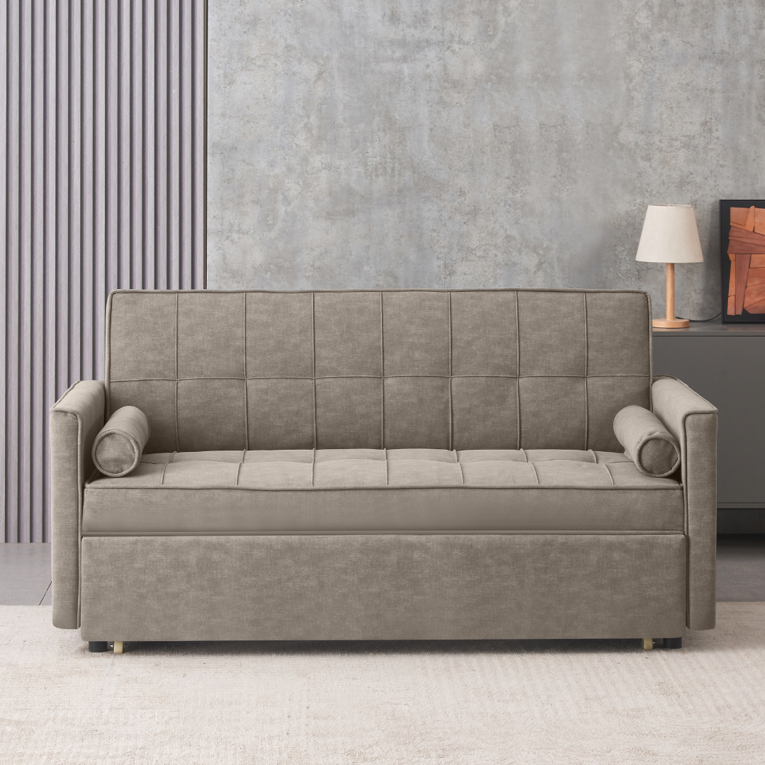 Transform your living space with this multifunctional Sairra sofa bed. Featuring a sleek modern design, tufted upholstery, and space-saving comfort, it’s perfect for guests and daily lounging. Available in Brown and Grey.
