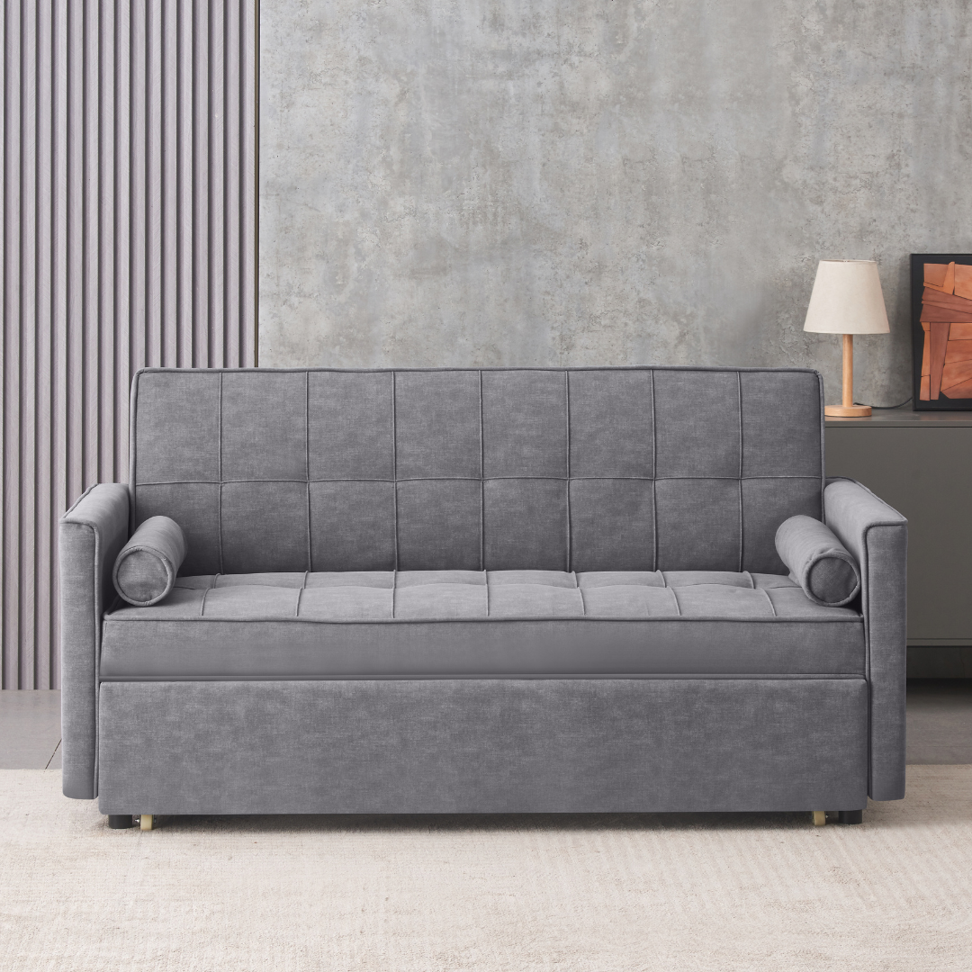 Crafted with high-density foam cushions and supportive armrests, it ensures lasting comfort. The included cylindrical bolster pillows add a decorative and ergonomic touch. Ideal for small apartments, guest rooms, or minimalist interiors, this sofa bed blends modern aesthetics with practical living.