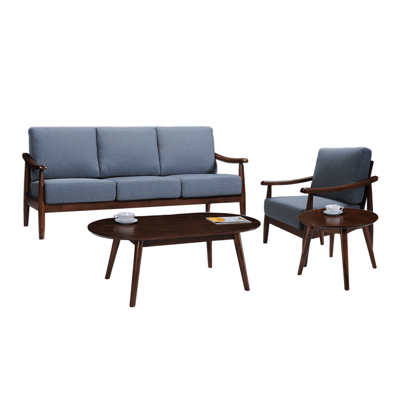 The Sapira sofa set is a 1+3+1-seater wooden sofa set with a complementary coffee table and end table. Each sofa is characterized by smooth legs and armrests, with neutral-colored fabric cushions and a deep brown wooden body. The solid wood boards are sure to last the test of time, and the cushion seats are comfortable even for prolonged sitting, lounging or sleeping. The Tommy tables look effortlessly elegant look and offer plenty of table space for your magazines, decorations or mugs. Keep your morning or evening essentials within reach.