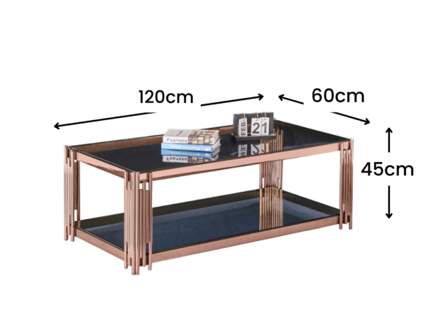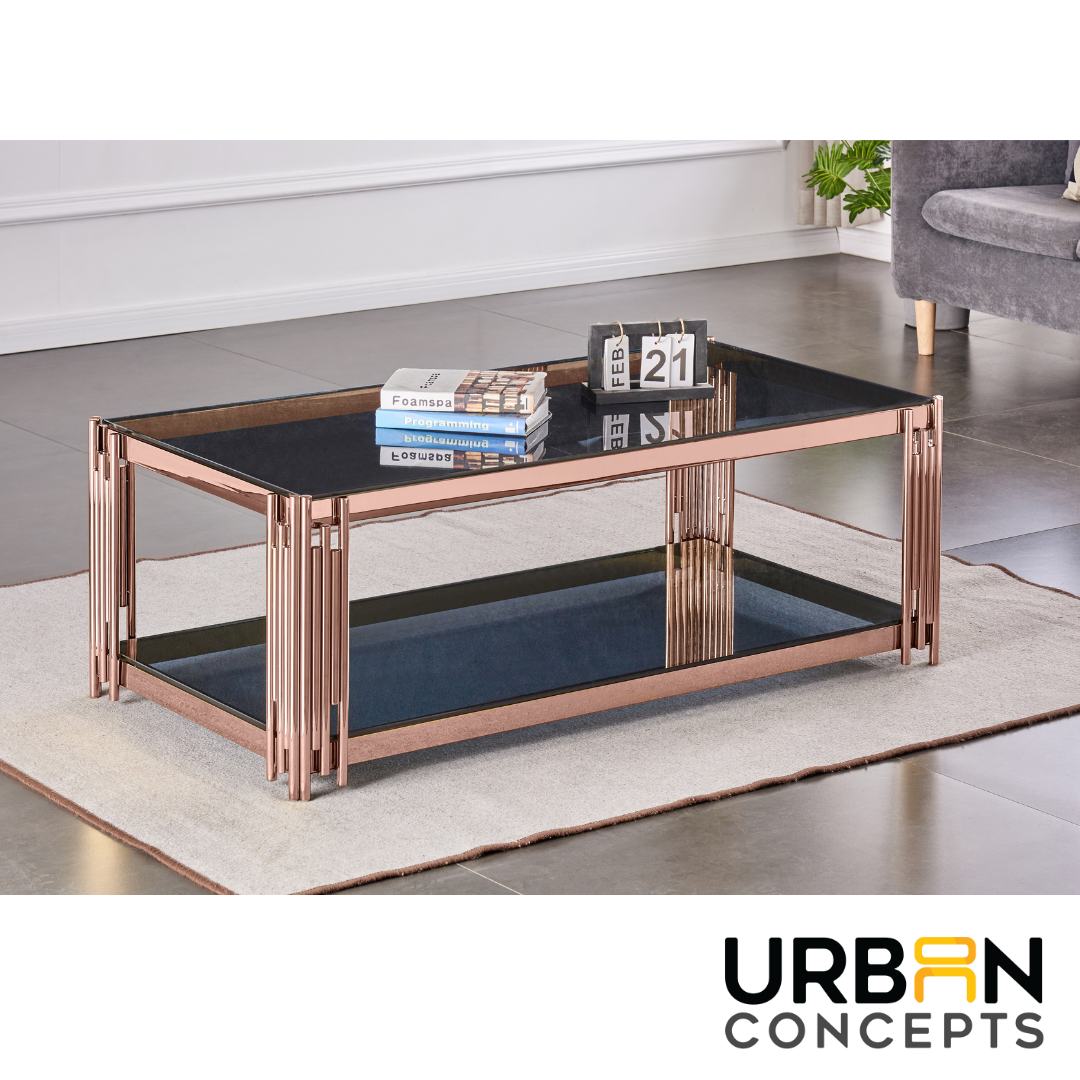 The Tiffany coffee table is part of the Tiffany table series composed of a coffee, end & console table. The tables are made of thick grey tempered glass, and the legs are Rose Gold colored stainless steel. Durable, beautiful, and the perfect accent to your home’s decor.