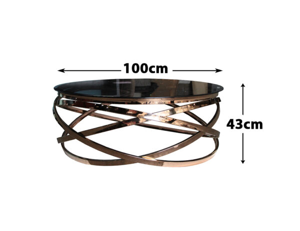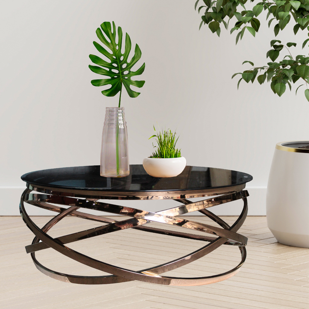 The Tobyn Coffee Table features a classic grey tempered glass that is a beautiful contrast against the rose gold stainless steel base. Its large size allows you a generous space to display all of your home accessories and decor. The unique bottom adds an intriguing design element that instantly captures your attention.