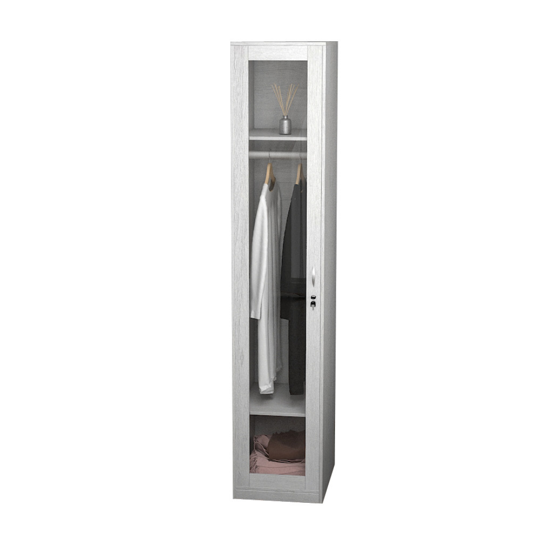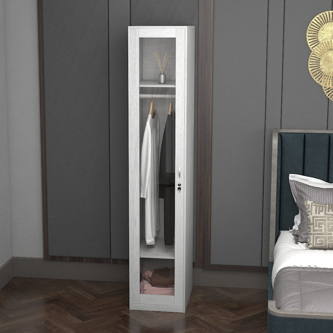 The Wesley Wardrobe is a simple yet stunning piece of furniture, featuring a single glass door design with upper and lower shelves as well as a hanger rod for easy storage of your clothes.