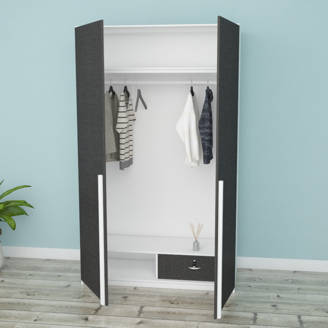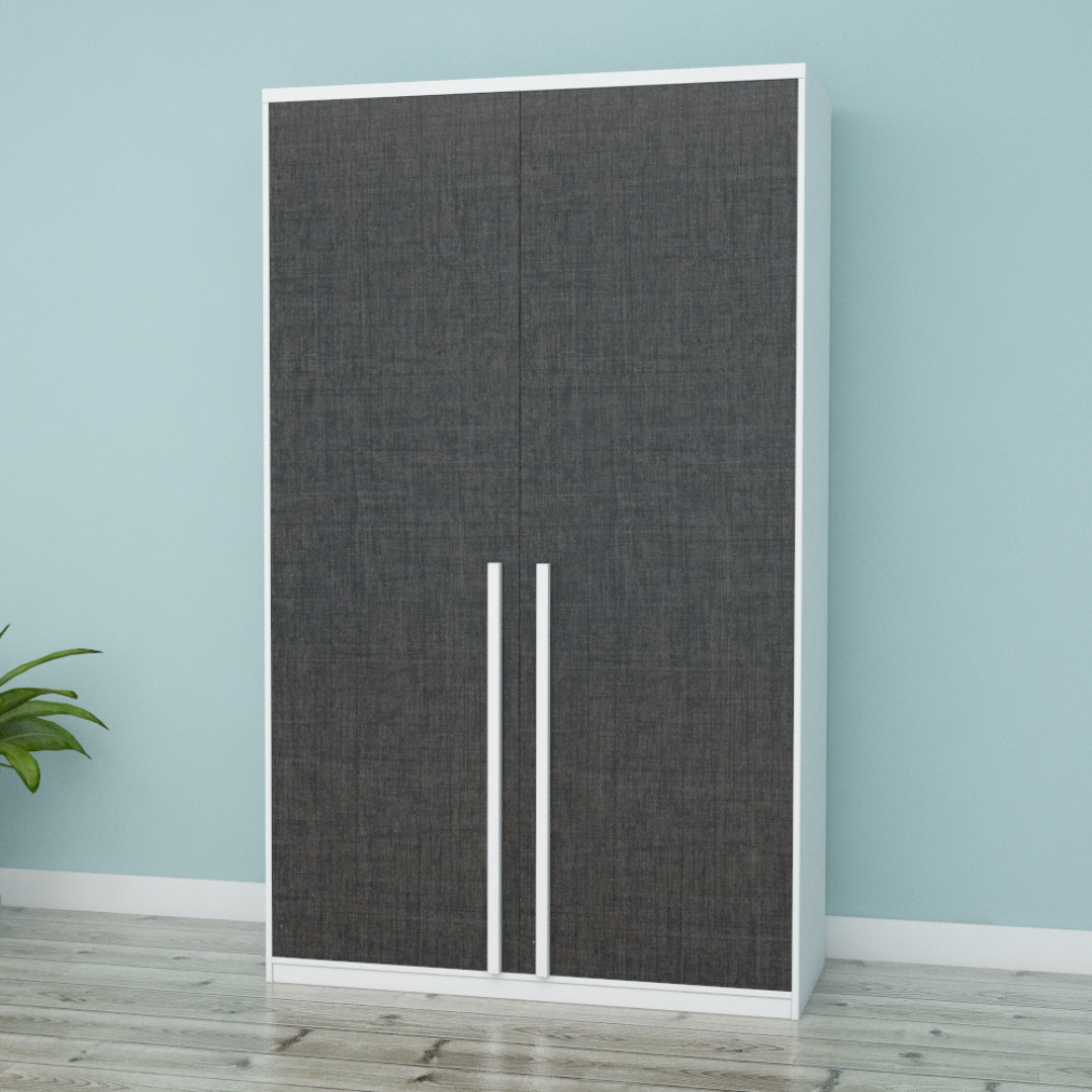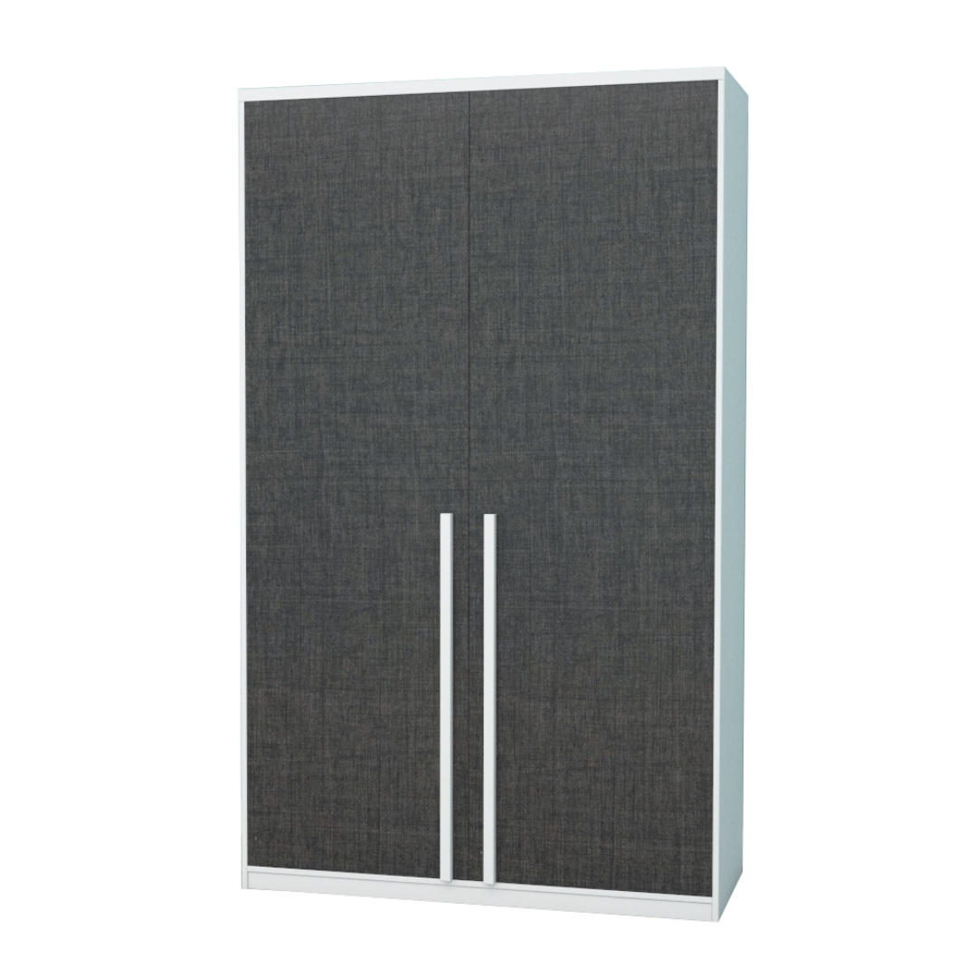 - The 2-door structure flaunts a distinct 3D paper laminated in dark denim finish, contrasting with the clean white of the wooden architecture. Wondering about its dimensions? With a size of W120 x D55 x H200 cm, it offers ample space for all your clothing and accessories without overwhelming your room’s layout.